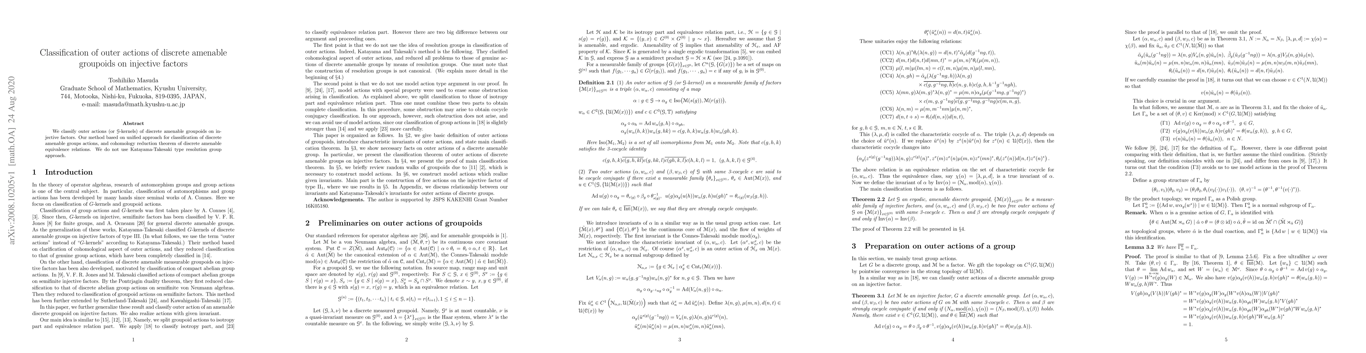 This paper classifies outer actions of discrete amenable groupoids on injective factors using a unified approach for classifying actions of discrete amenable groups and a cohomology reduction theorem. It avoids the Katayama-Takesaki type resolution group approach.