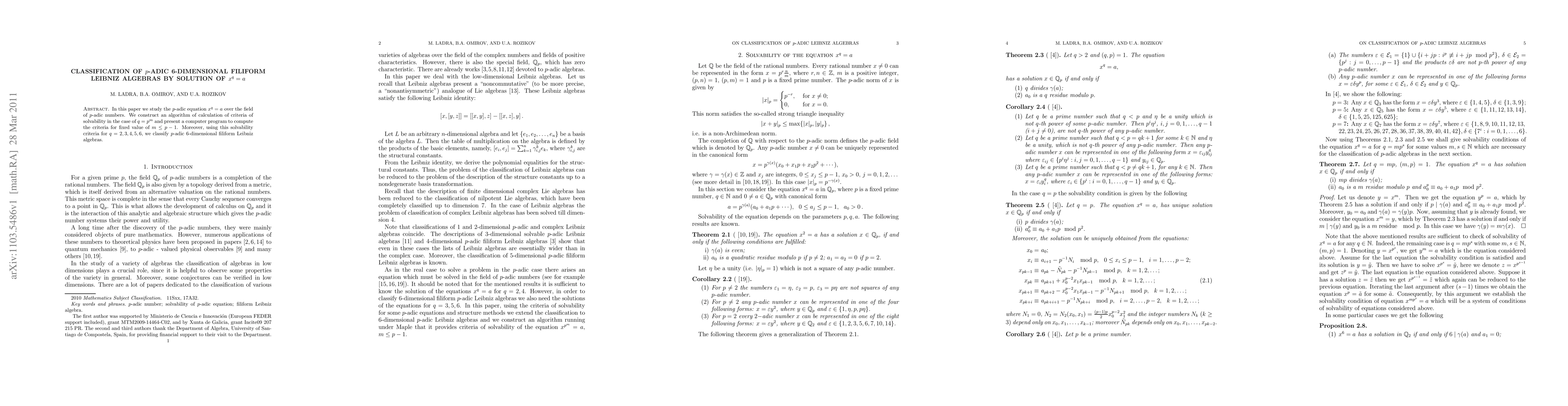 In this paper we study the $p$-adic equation $x^q=a$ over the field of $p$-adic numbers. We construct an algorithm of calculation of criteria of solvability in the case of $q=p^m$ and present a computer program to compute the criteria for fixed value of $m \leq p-1$. Moreover, using this solvability criteria for $q=2,3,4,5,6$, we classify $p$-adic 6-dimensional filiform Leibniz algebras.