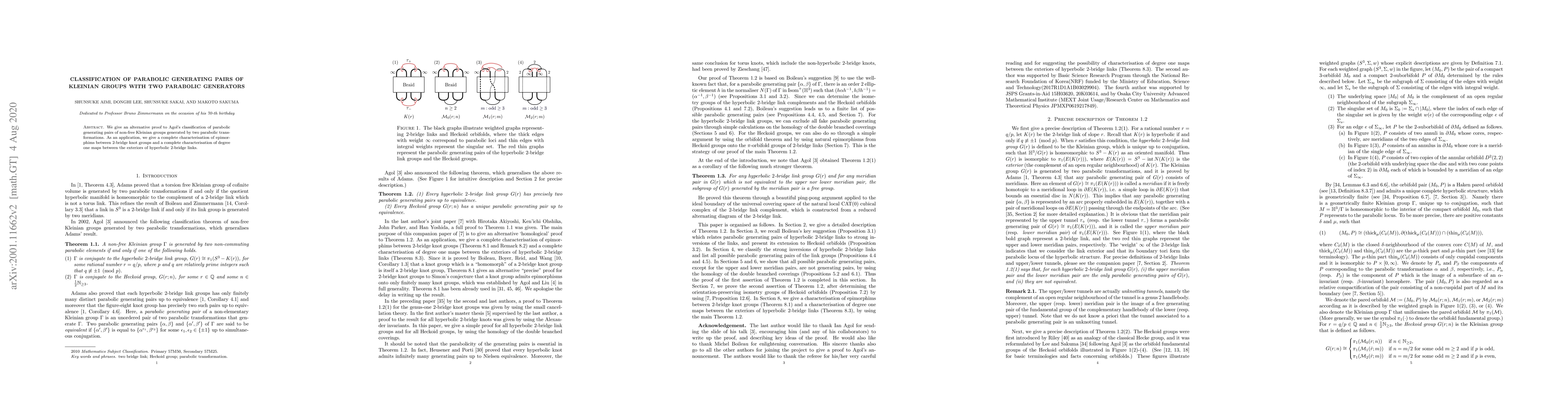 Title: Classification of parabolic generating pairs of Kleinian groups with two parabolic generators Summary: This paper provides an alternative proof for Agol's classification of parabolic generating pairs in Kleinian groups with two parabolic generators, and it also characterizes epimorphisms between $2$-bridge knot groups and degree one maps between the exteriors of hyperbolic $2$-bridge links.