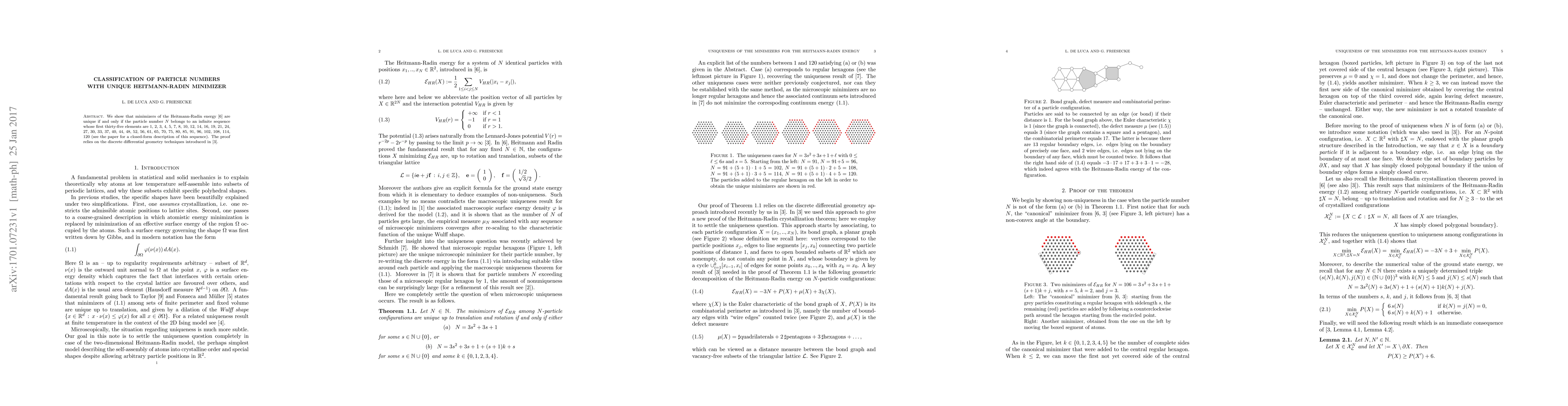We show that minimizers of the Heitmann-Radin energy (R. C. Heitmann, C. Radin, J. Stat. Phys. 22, 281-287, 1980) are unique if and only if the particle number N belongs to an infinite sequence whose first thirty-five elements are 1, 2, 3, 4, 5, 7, 8, 10, 12, 14, 16, 19, 21, 24, 27, 30, 33, 37, 40, 44, 48, 52, 56, 61, 65, 70, 75, 80, 85, 91, 96, 102, 108, 114, 120 (see the paper for a closed-form description of this sequence). The proof relies on the discrete differential geometry techniques introduced in (L. De Luca, G. Friesecke, preprint).