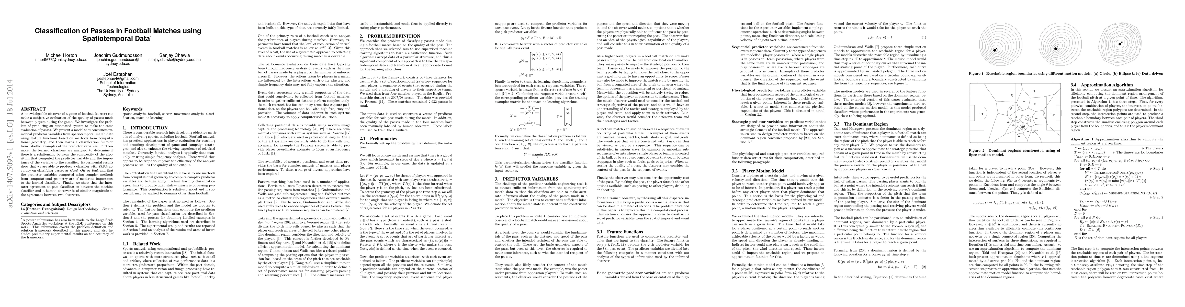 This paper develops an automated system to classify football passes as Good, OK, or Bad using spatiotemporal data and computational geometry. The model achieves 85.8% accuracy and finds that complex predictor variables have moderate importance, with inter-rater agreement between machine and human observers comparable to that between two humans.