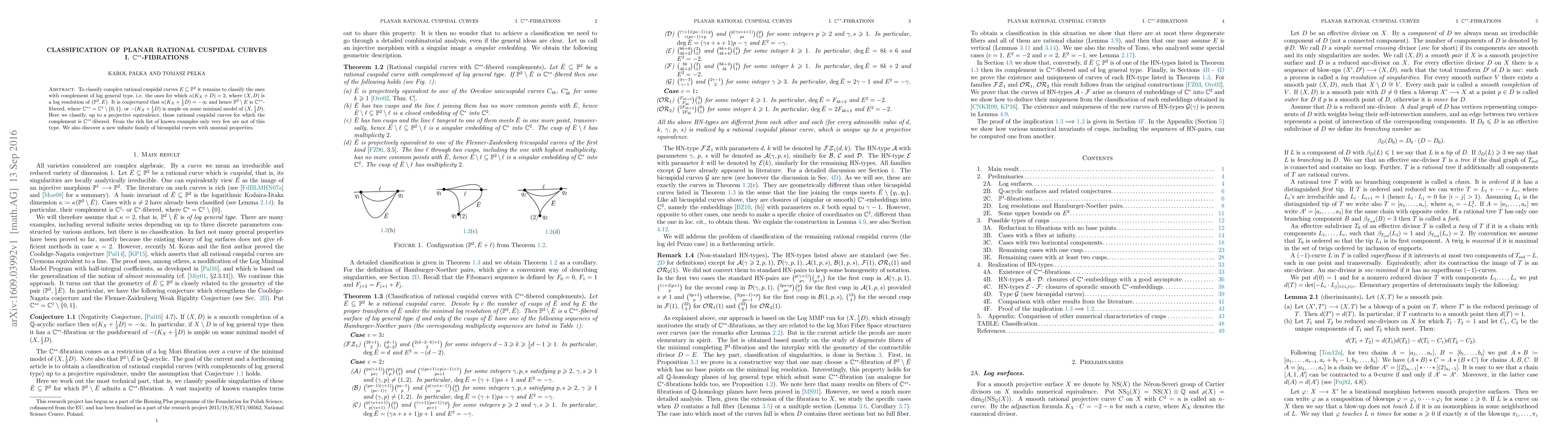 To classify complex rational cuspidal curves $E\subseteq \mathbb{P}^2$ it remains to classify the ones with complement of log general type, i.e. the ones for which $\kappa(K_X+D)=2$, where $(X,D)$ is a log resolution of $(\mathbb{P}^2,E)$. It is conjectured that $\kappa(K_X+\frac{1}{2}D)=-\infty$ and hence $\mathbb{P}^2\setminus E$ is $\mathbb{C}^{**}$-fibered, where $\mathbb{C}^{**}=\mathbb{C}^1\setminus\{0,1\}$, or $-(K_X+\frac{1}{2}D)$ is ample on some minimal model of $(X,\frac{1}{2}D)$. Here we classify, up to a projective equivalence, those rational cuspidal curves for which the complement is $\mathbb{C}^{**}$-fibered. From the rich list of known examples only very few are not of this type. We also discover a new infinite family of bicuspidal curves with unusual properties.