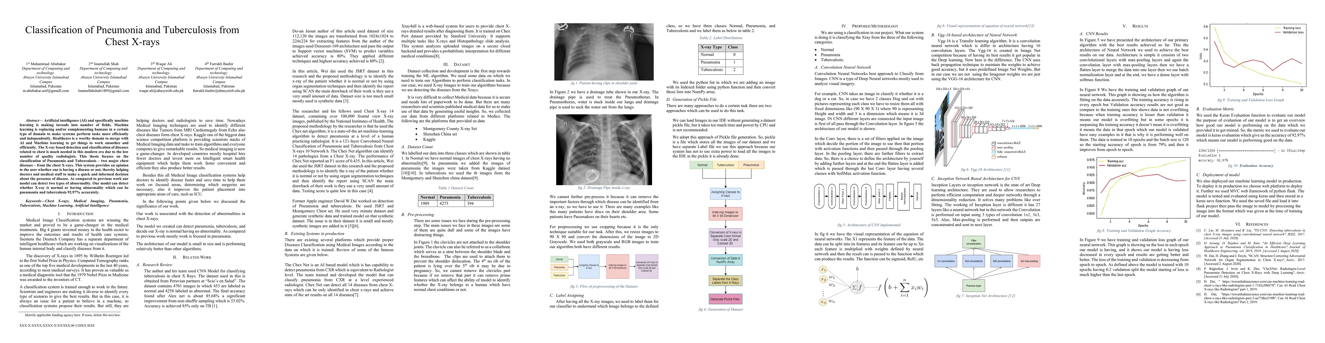 Artificial intelligence (AI) and specifically machine learning is making inroads into number of fields. Machine learning is replacing and/or complementing humans in a certain type of domain to make systems perform tasks more efficiently and independently. Healthcare is a worthy domain to merge with AI and Machine learning to get things to work smoother and efficiently. The X-ray based detection and classification of diseases related to chest is much needed in this modern era due to the low number of quality radiologists. This thesis focuses on the classification of Pneumonia and Tuberculosis two major chest diseases from the chest X-rays. This system provides an opinion to the user whether one is having a disease or not, thereby helping doctors and medical staff to make a quick and informed decision about the presence of disease. As compared to previous work our model can detect two types of abnormality. Our model can detect whether X-ray is normal or having abnormality which can be pneumonia and tuberculosis 92.97% accurately.