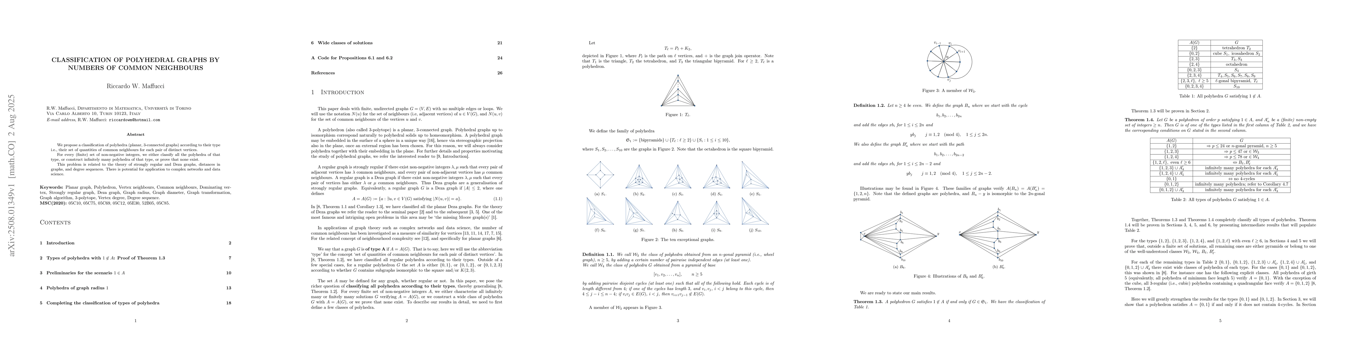 We propose a classification of polyhedra (planar, $3$-connected graphs) according to their type i.e., their set of quantities of common neighbours for each pair of distinct vertices. For every (finite) set of non-negative integers, we either classify all the polyhedra of that type, or construct infinitely many polyhedra of that type, or prove that none exist. This problem is related to the theory of strongly regular and Deza graphs, distances in graphs, and degree sequences. There is potential for application to complex networks and data science.
