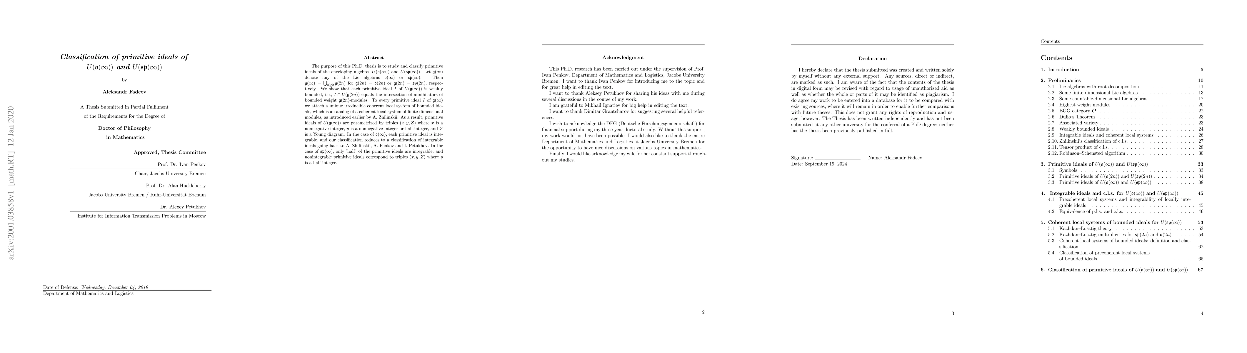 The purpose of this Ph.D. thesis is to study and classify primitive ideals of the enveloping algebras $U(\mathfrak{o}(\infty))$ and $U(\mathfrak{sp}(\infty))$. Let $\mathfrak{g}(\infty)$ denote any of the Lie algebras $\mathfrak{o}(\infty)$ or $\mathfrak{sp}(\infty)$. Then\break $\mathfrak{g}(\infty)=\bigcup_{n\geq 2} \mathfrak{g}(2n)$ for $\mathfrak{g}(2n)=\mathfrak{o}(2n)$ or $\mathfrak{g}(2n)=\mathfrak{sp}(2n)$, respectively. We show that each primitive ideal $I$ of $U(\mathfrak{g}(\infty))$ is weakly bounded, i.e., $I\cap U(\mathfrak{g}(2n))$ equals the intersection of annihilators of bounded weight $\mathfrak{g}(2n)$-modules. To every primitive ideal $I$ of $\mathfrak{g}(\infty)$ we attach a unique irreducible coherent local system of bounded ideals, which is an analog of a coherent local system of finite-dimensional modules, as introduced earlier by A. Zhilinskii. As a result, primitive ideals of $U(\mathfrak{g}(\infty))$ are parametrized by triples $(x,y,Z)$ where $x$ is a nonnegative integer, $y$ is a nonnegative integer or half-integer, and $Z$ is a Young diagram. In the case of $\mathfrak{o}(\infty)$, each primitive ideal is integrable, and our classification reduces to a classification of integrable ideals going back to A. Zhilinskii, A. Penkov and I. Petukhov. In the case of $\mathfrak{sp}(\infty)$, only 'half' of the primitive ideals are integrable, and nonintegrable primitive ideals correspond to triples $(x,y,Z)$ where $y$ is a half-integer.