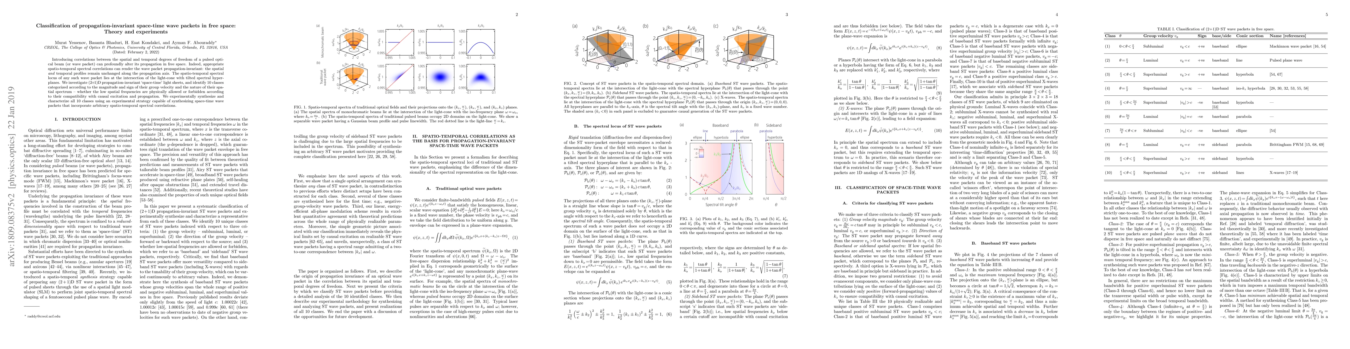 This paper classifies 10 types of propagation-invariant space-time wave packets in free space based on their group velocity and spatial spectrum properties. Experimentally, it synthesizes and characterizes these wave packets using a method that can incorporate arbitrary spatio-temporal correlations.