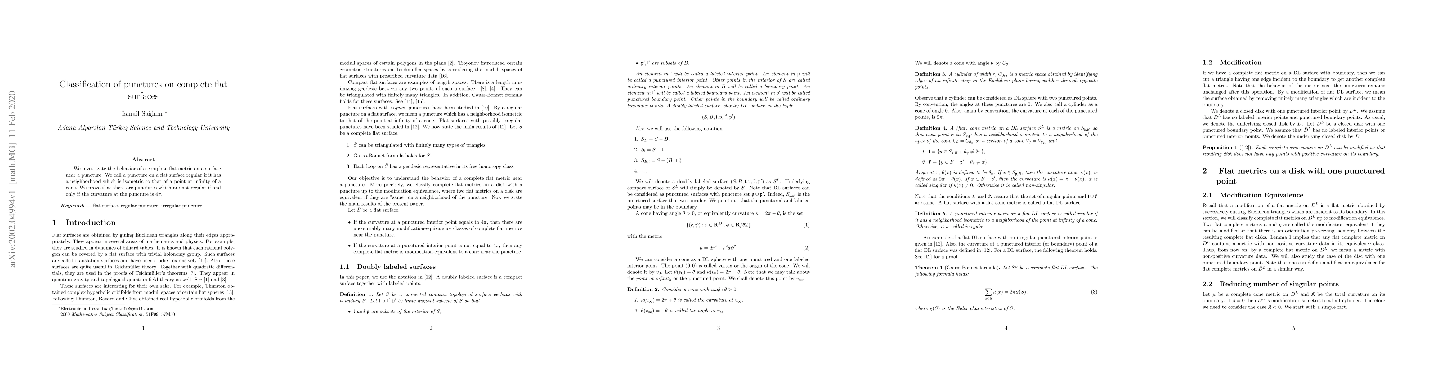 We investigate the behavior of a complete flat metric on a surface near a puncture. We call a puncture on a flat surface regular if it has a neighborhood which is isometric to that of a point at infinity of a cone. We prove that there are punctures which are not regular if and only if the curvature at the puncture is $4\pi$.
