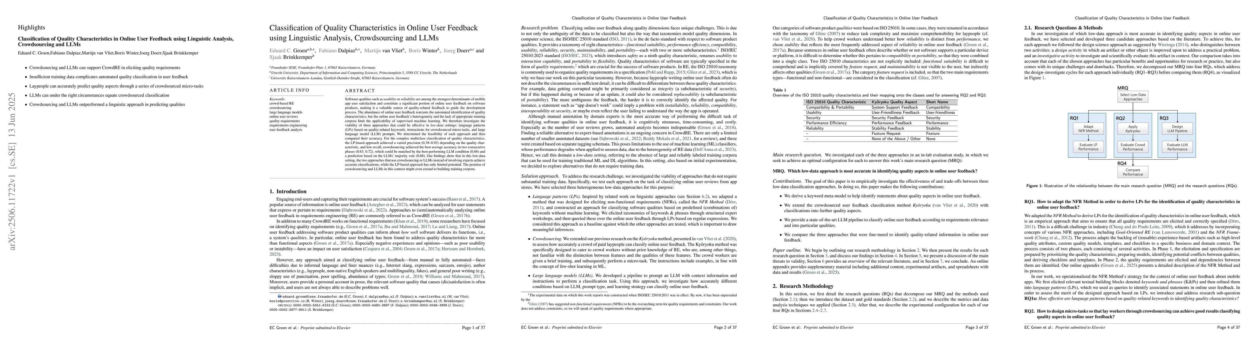 Software qualities such as usability or reliability are among the strongest determinants of mobile app user satisfaction and constitute a significant portion of online user feedback on software products, making it a valuable source of quality-related feedback to guide the development process. The abundance of online user feedback warrants the automated identification of quality characteristics, but the online user feedback's heterogeneity and the lack of appropriate training corpora limit the applicability of supervised machine learning. We therefore investigate the viability of three approaches that could be effective in low-data settings: language patterns (LPs) based on quality-related keywords, instructions for crowdsourced micro-tasks, and large language model (LLM) prompts. We determined the feasibility of each approach and then compared their accuracy. For the complex multiclass classification of quality characteristics, the LP-based approach achieved a varied precision (0.38-0.92) depending on the quality characteristic, and low recall; crowdsourcing achieved the best average accuracy in two consecutive phases (0.63, 0.72), which could be matched by the best-performing LLM condition (0.66) and a prediction based on the LLMs' majority vote (0.68). Our findings show that in this low-data setting, the two approaches that use crowdsourcing or LLMs instead of involving experts achieve accurate classifications, while the LP-based approach has only limited potential. The promise of crowdsourcing and LLMs in this context might even extend to building training corpora.