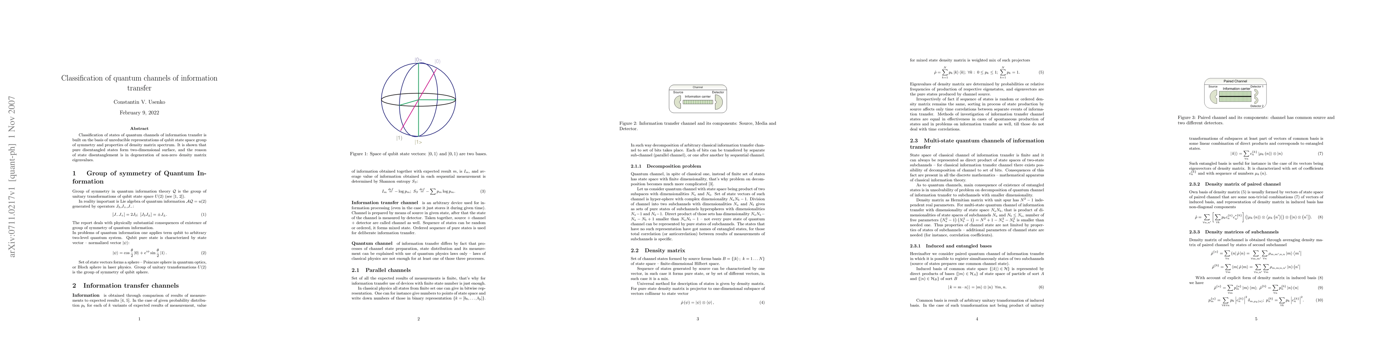 Classification of states of quantum channels of information transfer is built on the basis of unreducible representations of qubit state space group of symmetry and properties of density matrix spectrum. It is shown that pure disentangled states form two-dimensional surface, and the reason of state disentanglement is in degeneration of non-zero density matrix eigenvalues
