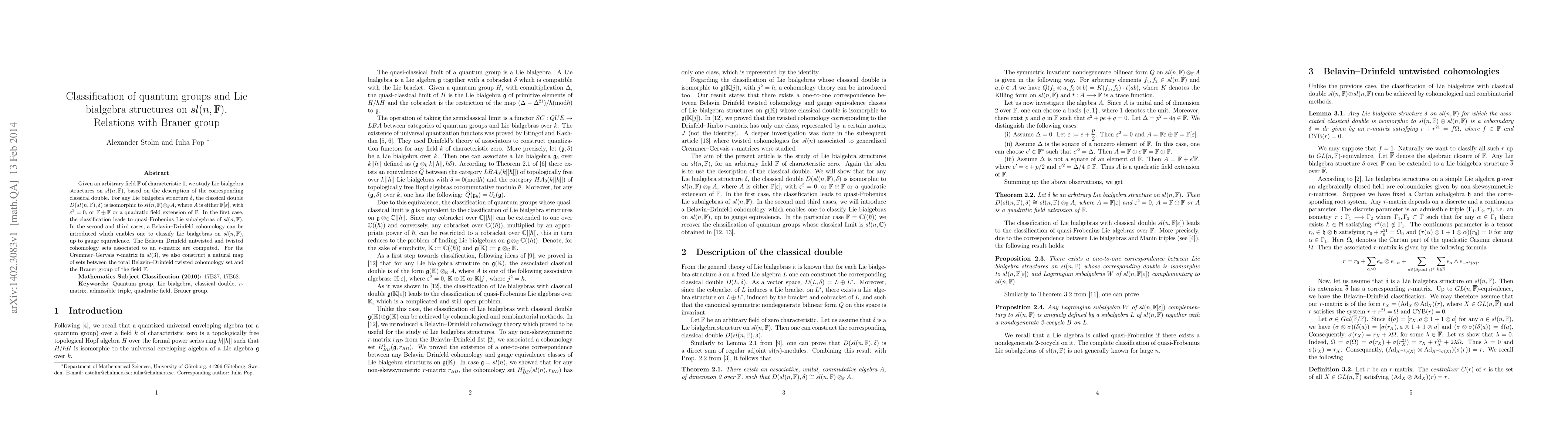 Given an arbitrary field $\mathbb{F}$ of characteristic 0, we study Lie bialgebra structures on $sl(n,\mathbb{F})$, based on the description of the corresponding classical double. For any Lie bialgebra structure $\delta$, the classical double $D(sl(n,\mathbb{F}),\delta)$ is isomorphic to $sl(n,\mathbb{F})\otimes_{\mathbb{F}} A$, where $A$ is either $\mathbb{F}[\varepsilon]$, with $\varepsilon^{2}=0$, or $\mathbb{F}\oplus \mathbb{F}$ or a quadratic field extension of $\mathbb{F}$. In the first case, the classification leads to quasi-Frobenius Lie subalgebras of $sl(n,\mathbb{F})$. In the second and third cases, a Belavin--Drinfeld cohomology can be introduced which enables one to classify Lie bialgebras on $sl(n,\mathbb{F})$, up to gauge equivalence. The Belavin--Drinfeld untwisted and twisted cohomology sets associated to an $r$-matrix are computed. For the Cremmer--Gervais $r$-matrix in $sl(3)$, we also construct a natural map of sets between the total Belavin--Drinfeld twisted cohomology set and the Brauer group of the field $\mathbb{F}$.