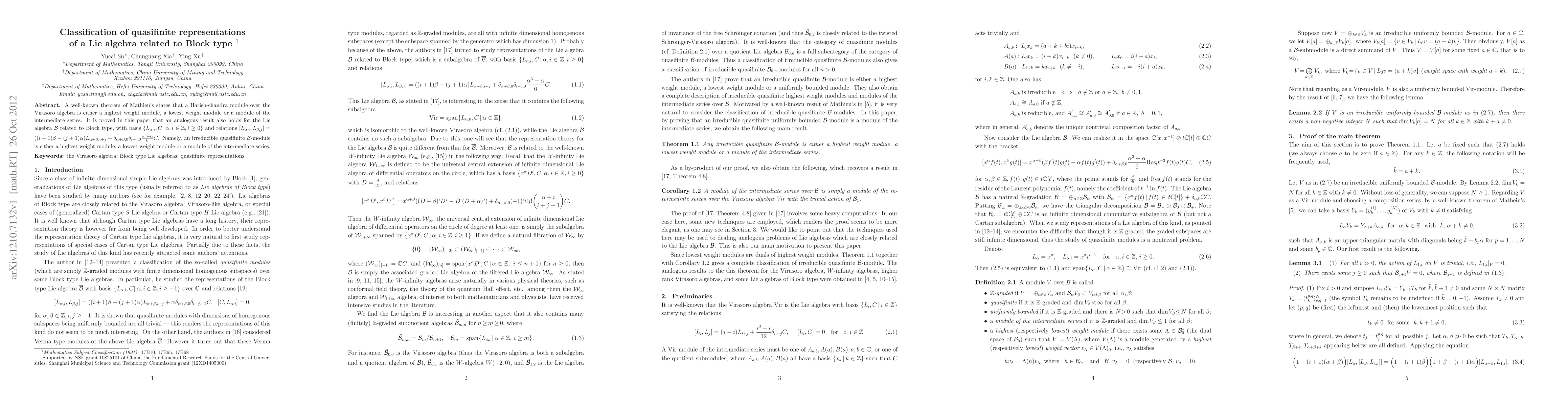 A well-known theorem of Mathieu's states that a Harish-chandra module over the Virasoro algebra is either a highest weight module, a lowest weight module or a module of the intermediate series. It is proved in this paper that an analogous result also holds for the Lie algebra $\BB$ related to Block type, with basis {L_{\a,i},C|a,i\in\Z, i\ge0} and relations [L_{\a,i},L_{\b,j}]=((i+1)\b-(j+1)\a)L_{\a+\b,i+j}+\d_{\a+\b,0}\d_{i+j,0}\frac{\a^3-\a}{6}C, [C,L_{\a,i}]=0.Namely, an irreducible quasifinite $\BB$-module is either a highest weight module, a lowest weight module or a module of the intermediate series.