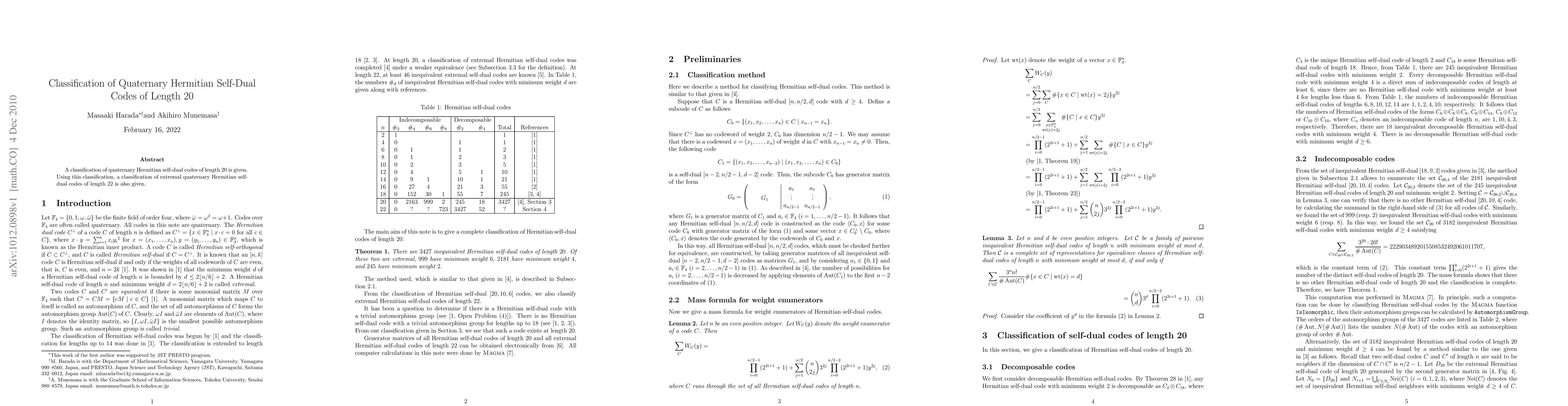This paper classifies quaternary Hermitian self-dual codes of length 20 and uses this classification to also classify extremal quaternary Hermitian self-dual codes of length 22. The findings provide a comprehensive understanding of these specific code structures.