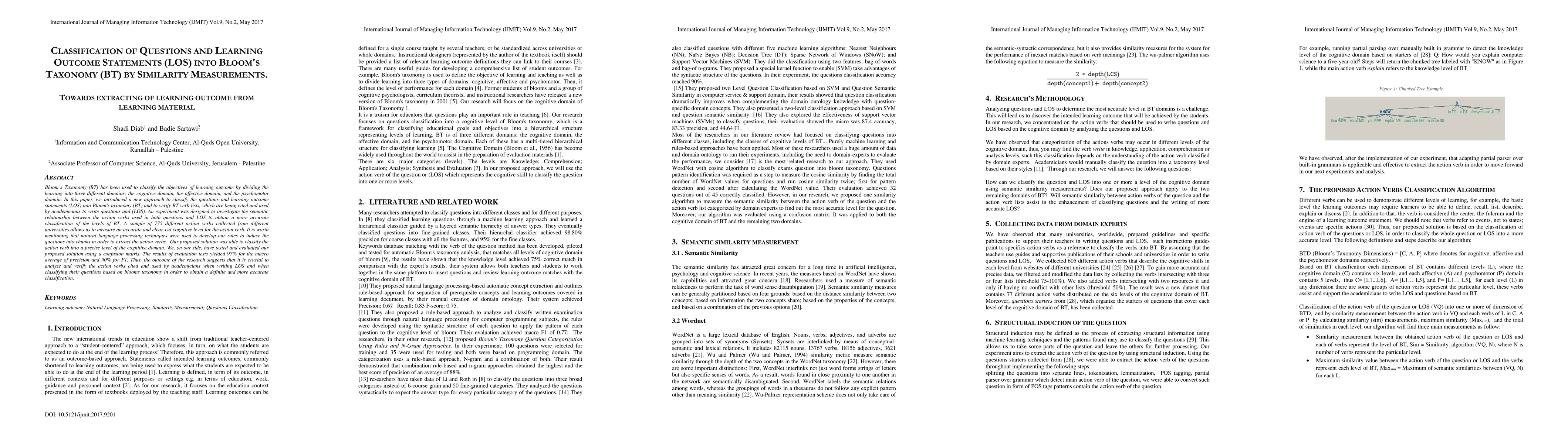 This paper introduces a new method for classifying questions and learning outcome statements into Bloom's Taxonomy using similarity measurements and natural language processing techniques. The proposed approach achieved high accuracy with 97% macro average precision and 90% F1 score, emphasizing the importance of verifying action verbs for precise classification.