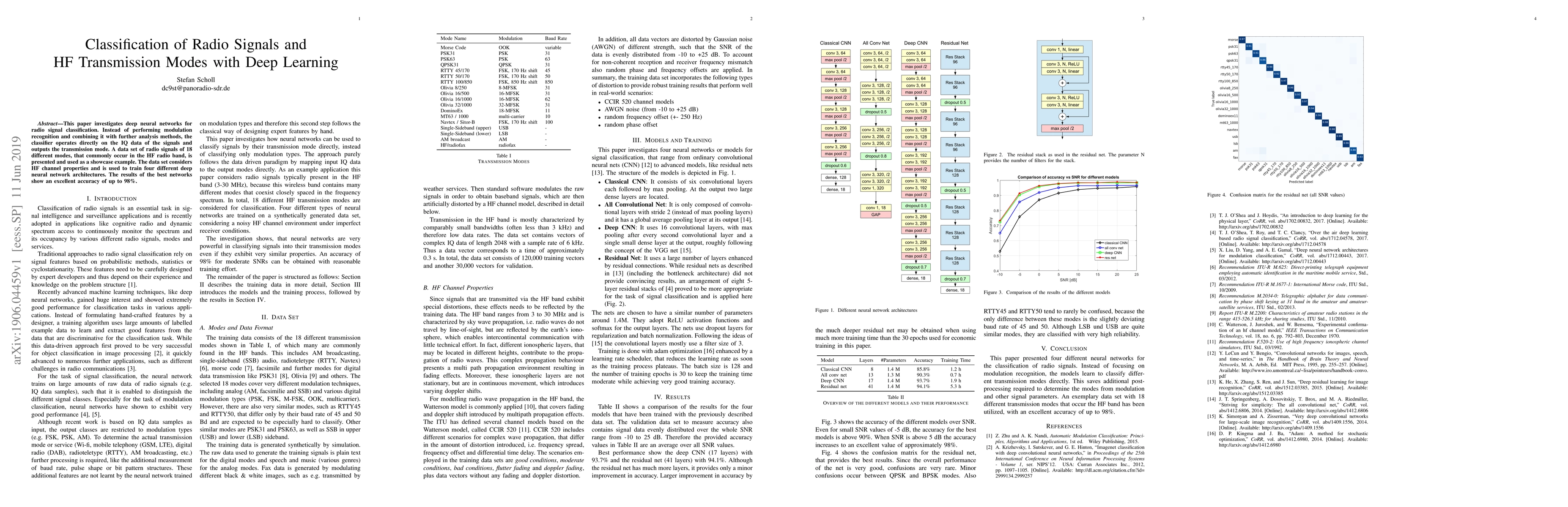 This paper explores deep neural networks for classifying radio signals directly from IQ data, achieving up to 98% accuracy. It presents a dataset of 18 HF transmission modes and trains four different neural network architectures to identify the transmission modes without additional analysis.
