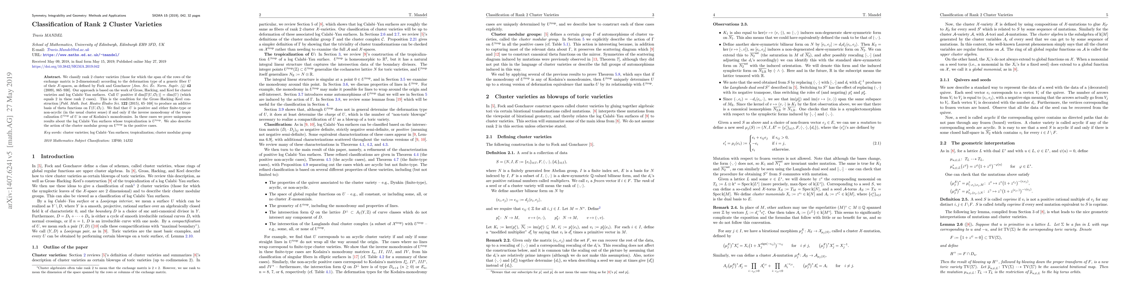 We classify rank $2$ cluster varieties (those for which the span of the rows of the exchange matrix is $2$-dimensional) according to the deformation type of a generic fiber $U$ of their ${\mathcal X}$-spaces, as defined by Fock and Goncharov [Ann. Sci. \'Ec. Norm. Sup\'er. (4) 42 (2009), 865-930]. Our approach is based on the work of Gross, Hacking, and Keel for cluster varieties and log Calabi-Yau surfaces. Call $U$ positive if $\dim[\Gamma(U,{\mathcal O}_U)] = \dim(U)$ (which equals 2 in these rank 2 cases). This is the condition for the Gross-Hacking-Keel construction [Publ. Math. Inst. Hautes \'Etudes Sci. 122 (2015), 65-168] to produce an additive basis of theta functions on $\Gamma(U,{\mathcal O}_U)$. We find that $U$ is positive and either finite-type or non-acyclic (in the usual cluster sense) if and only if the inverse monodromy of the tropicalization $U^{\rm trop}$ of $U$ is one of Kodaira's monodromies. In these cases we prove uniqueness results about the log Calabi-Yau surfaces whose tropicalization is $U^{\rm trop}$. We also describe the action of the cluster modular group on $U^{\rm trop}$ in the positive cases.