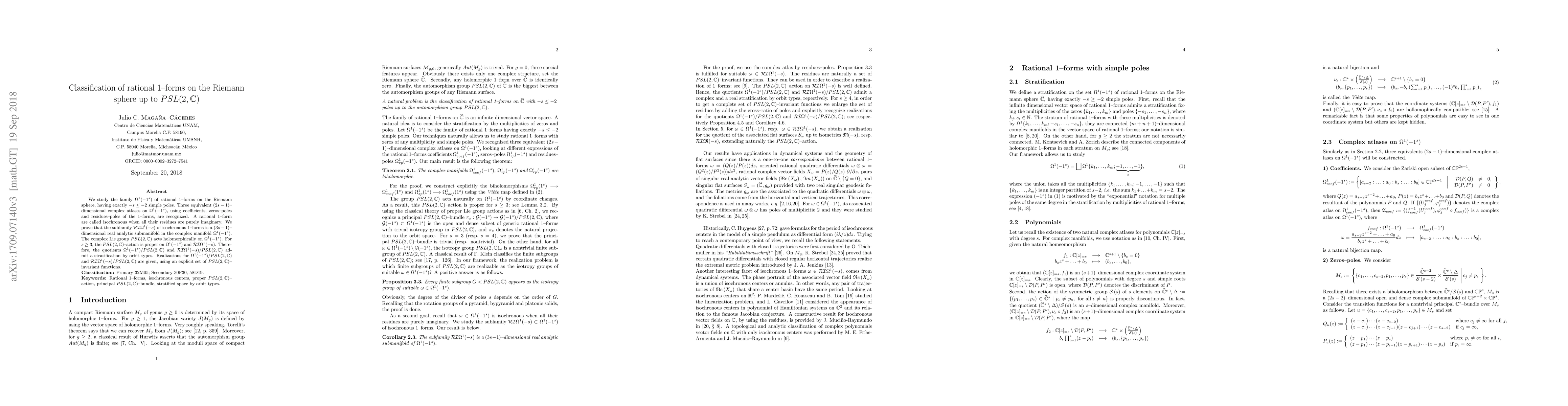 This paper classifies rational 1-forms on the Riemann sphere with simple poles, demonstrating that the isochronous subfamily forms a real submanifold. It studies the $PSL(2,\mathbb{C})$-action on these forms and provides explicit realizations for the quotient spaces by this action.