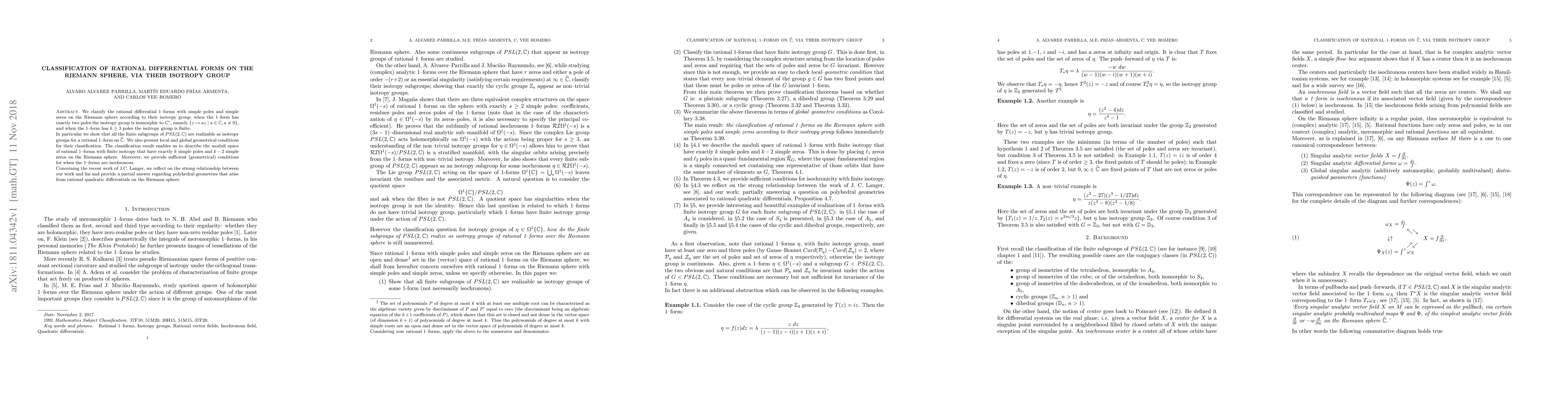 This paper classifies rational differential 1-forms on the Riemann sphere based on their isotropy group, showing that forms with two poles have an infinite isotropy group while those with three or more poles have finite isotropy groups corresponding to finite subgroups of $PSL(2,\mathbb{C})$. It also discusses moduli spaces and conditions for isochrony.