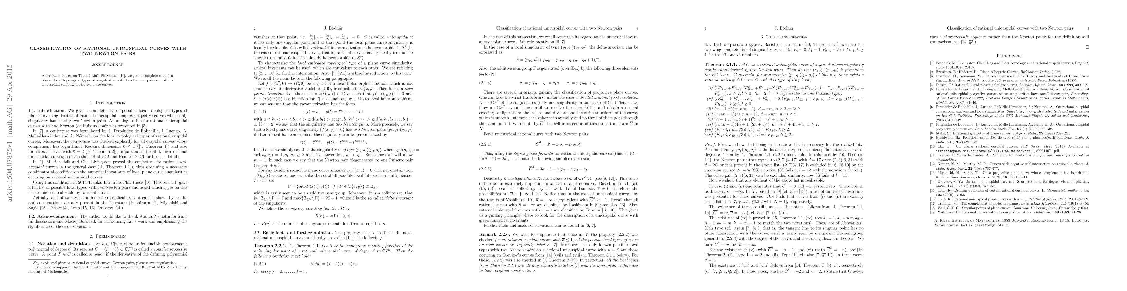 Based on Tiankai Liu's PhD thesis (MIT, 2014), we give a complete classification of local topological types of singularities with two Newton pairs on rational unicuspidal complex projective plane curves. We show that all but two possible local types on Liu's list are realizable by the work of H. Kashiwara, M. Miyanishi, T. Sugie, T. Fenske, K. Tono and S. Y. Orevkov.