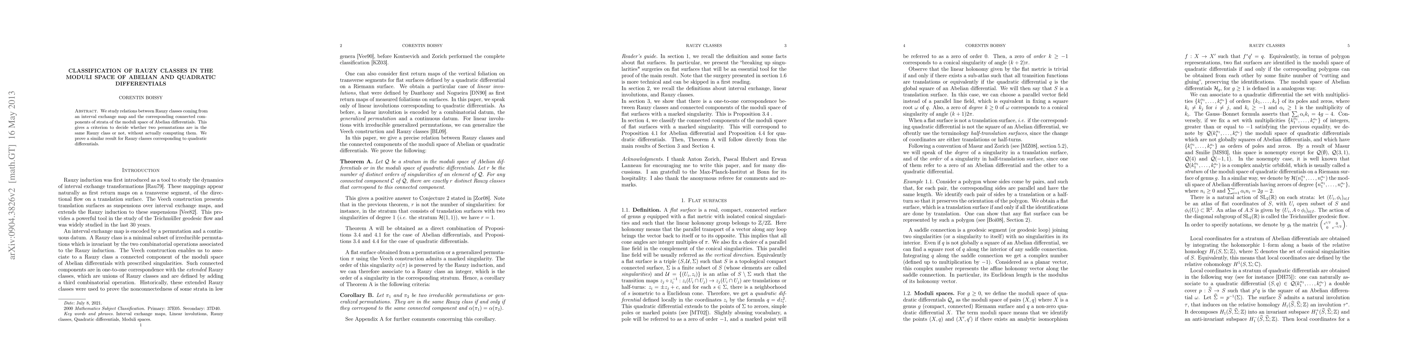 This paper provides a criterion for determining if two permutations belong to the same Rauzy class by examining their relation to strata in the moduli space of Abelian and quadratic differentials, without explicitly computing the classes. It also extends these results to Rauzy classes associated with quadratic differentials.