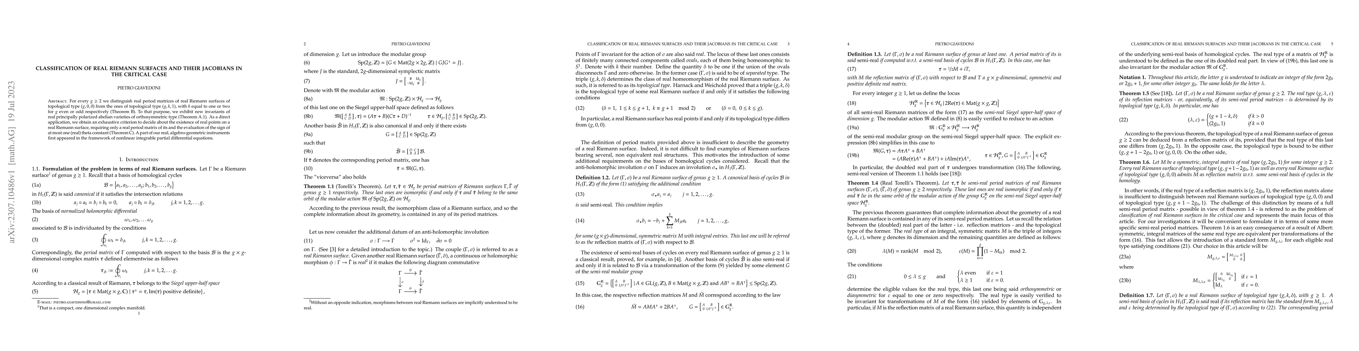 This paper classifies real Riemann surfaces based on their topological types and introduces new invariants for orthosymmetric real principally polarized abelian varieties. It provides a criterion for determining the existence of real points on a real Riemann surface using only a real period matrix and the sign of a theta constant.