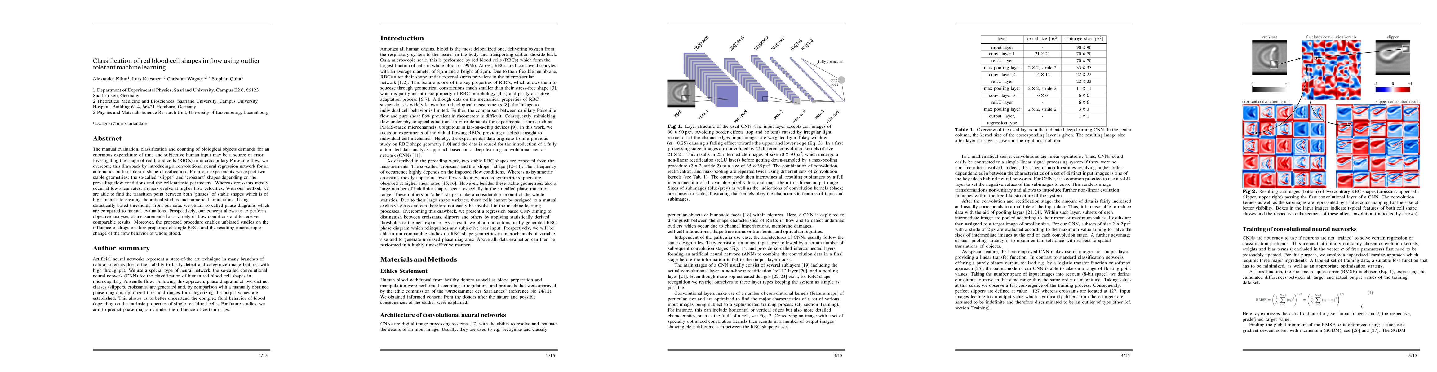 This paper introduces a convolutional neural regression network for automatic, outlier tolerant classification of red blood cell shapes in flow, identifying two stable geometries: slipper and croissant shapes. The method enables objective analysis of flow conditions and the study of drug effects on blood flow properties.