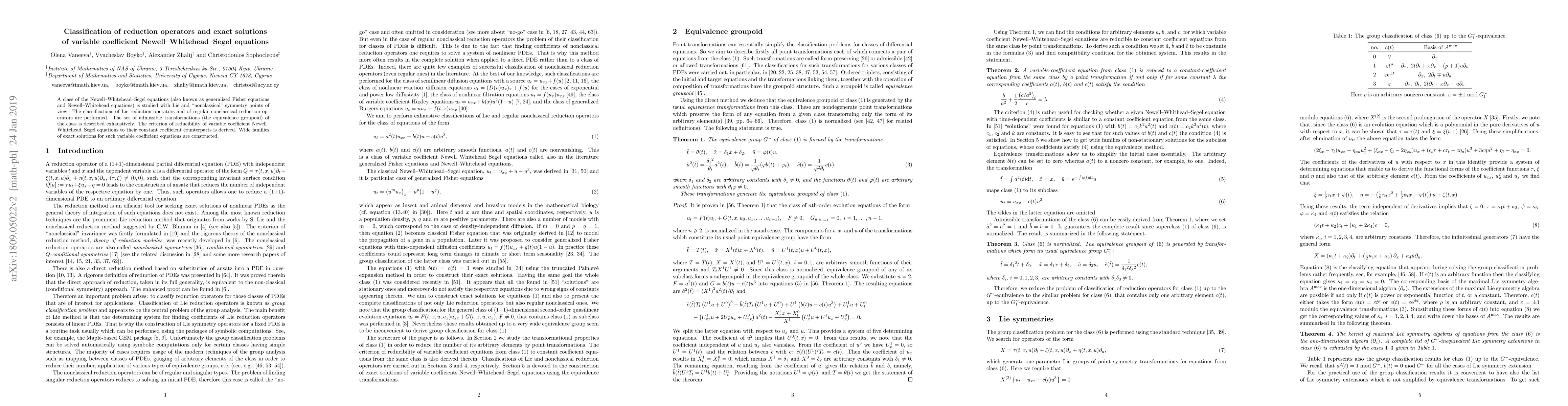 This paper classifies reduction operators for Newell-Whitehead-Segel equations and derives criteria for reducing variable coefficient forms to constant coefficient forms, while also constructing exact solutions for the variable coefficient versions.
