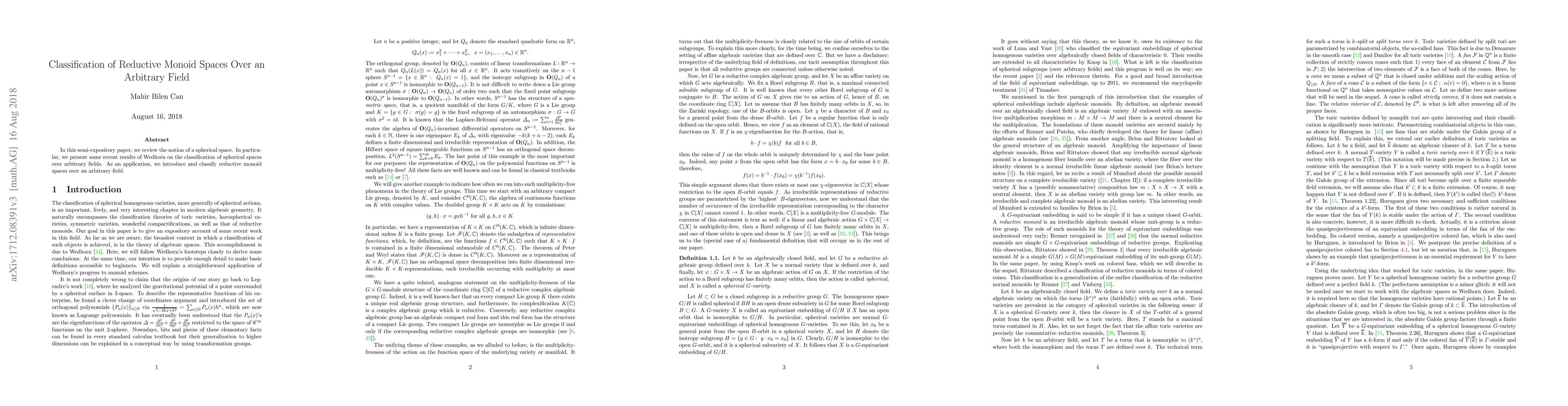 This paper reviews the classification of spherical spaces, highlighting recent results by Wedhorn, and applies these findings to classify reductive monoid spaces over arbitrary fields.