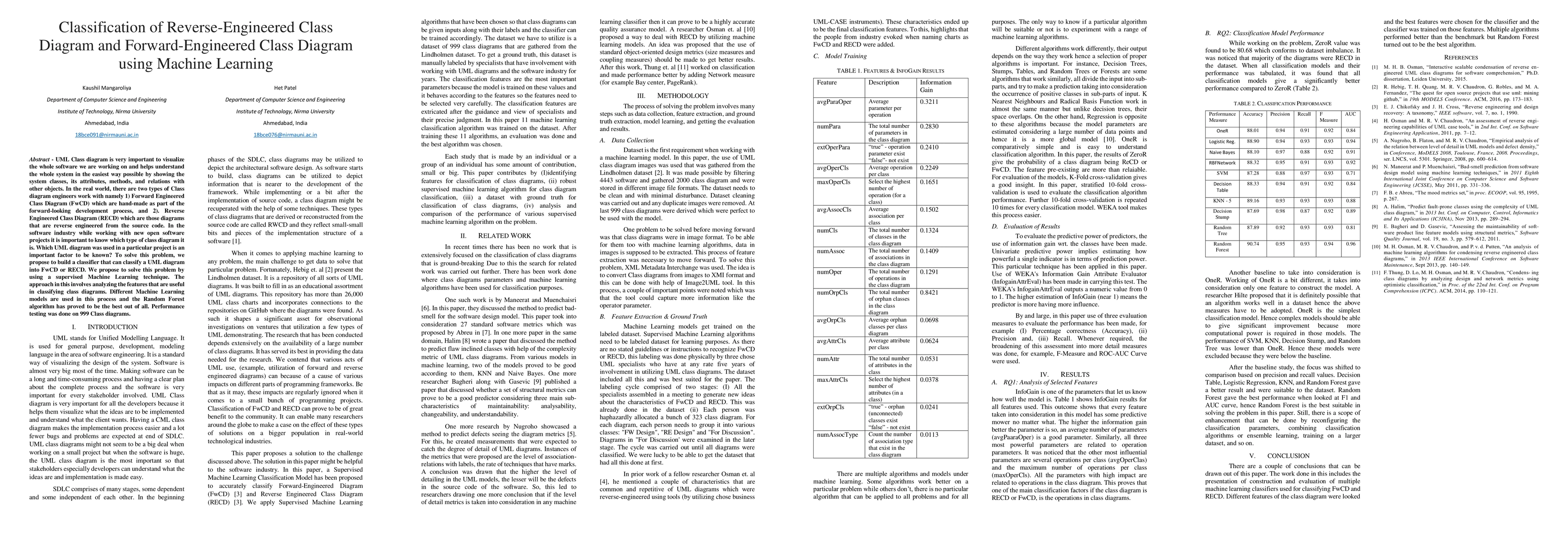 UML Class diagram is very important to visualize the whole software we are working on and helps understand the whole system in the easiest way possible by showing the system classes, its attributes, methods, and relations with other objects. In the real world, there are two types of Class diagram engineers work with namely 1) Forward Engineered Class Diagram (FwCD) which are hand-made as part of the forward-looking development process, and 2). Reverse Engineered Class Diagram (RECD) which are those diagrams that are reverse engineered from the source code. In the software industry while working with new open software projects it is important to know which type of class diagram it is. Which UML diagram was used in a particular project is an important factor to be known? To solve this problem, we propose to build a classifier that can classify a UML diagram into FwCD or RECD. We propose to solve this problem by using a supervised Machine Learning technique. The approach in this involves analyzing the features that are useful in classifying class diagrams. Different Machine Learning models are used in this process and the Random Forest algorithm has proved to be the best out of all. Performance testing was done on 999 Class diagrams.