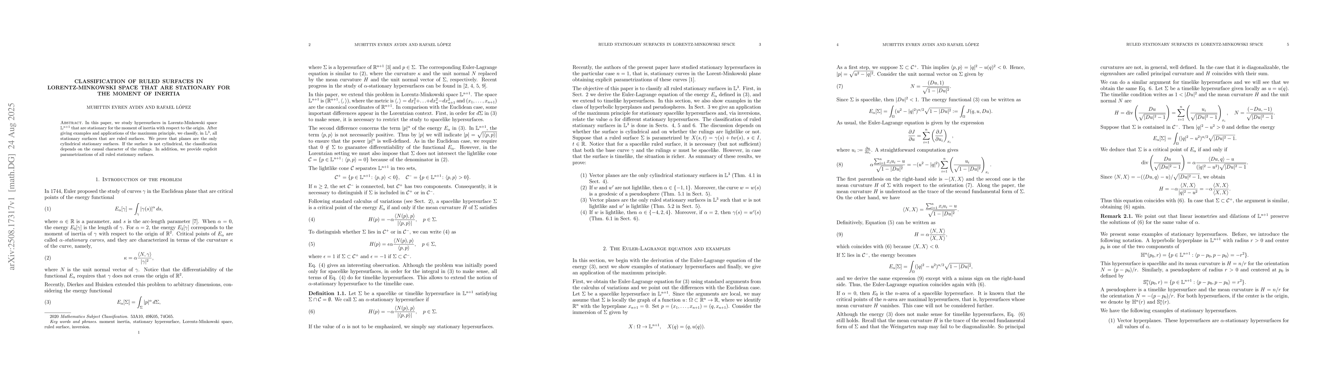 In this paper, we study hypersurfaces in Lorentz-Minkowski space $\mathbb{L}^{n+1}$ that are stationary for the moment of inertia with respect to the origin. After giving examples and applications of the maximum principle, we classify, in $\mathbb{L}^3$, all stationary surfaces that are ruled surfaces. We prove that planes are the only cylindrical stationary surfaces. If the surface is not cylindrical, the classification depends on the causal character of the rulings. In addition, we provide explicit parametrizations of all ruled stationary surfaces.