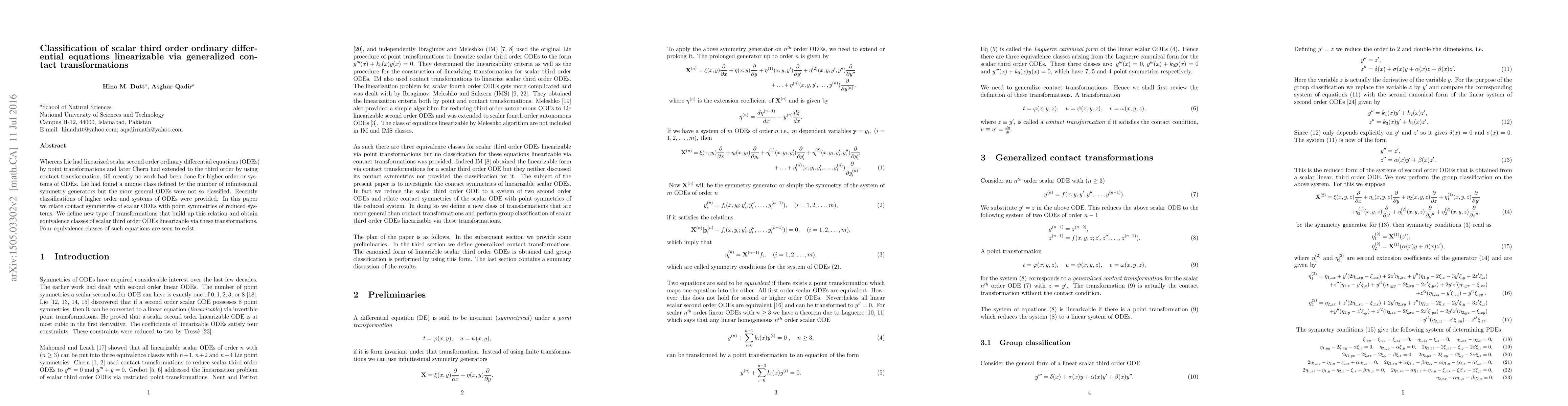 This paper classifies scalar third-order ordinary differential equations (ODEs) that can be linearized via generalized contact transformations. It introduces new transformations linking contact symmetries and point symmetries, revealing four equivalence classes of such linearizable ODEs.