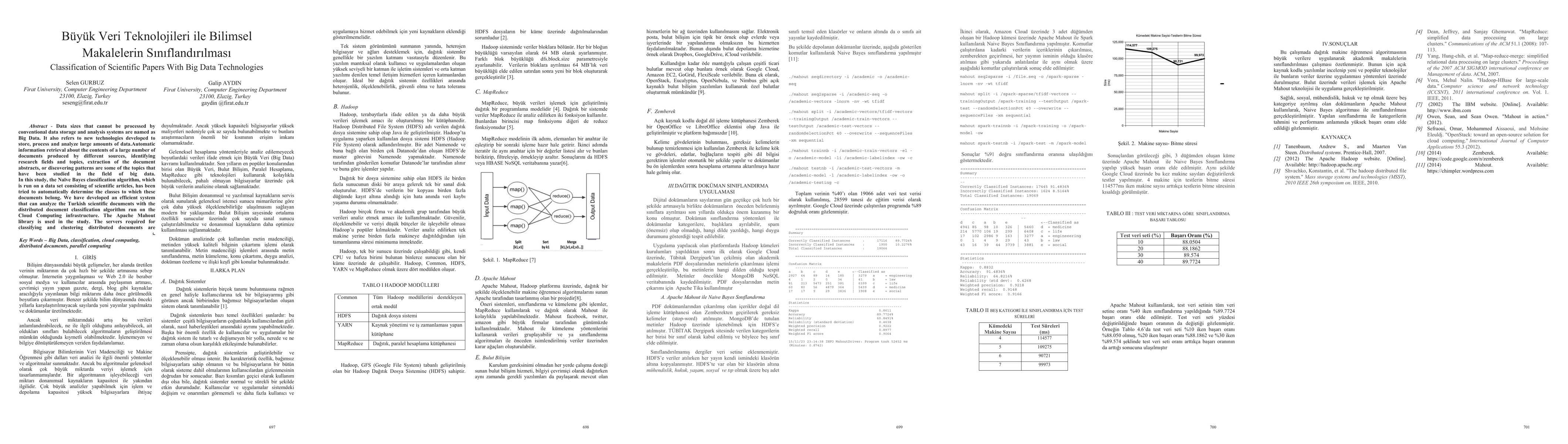 Summary: This study employs the Naive Bayes classification algorithm to automatically categorize Turkish scientific articles. Utilizing Apache Mahout on a cloud computing infrastructure, the research develops an efficient system for distributed document classification and analysis.