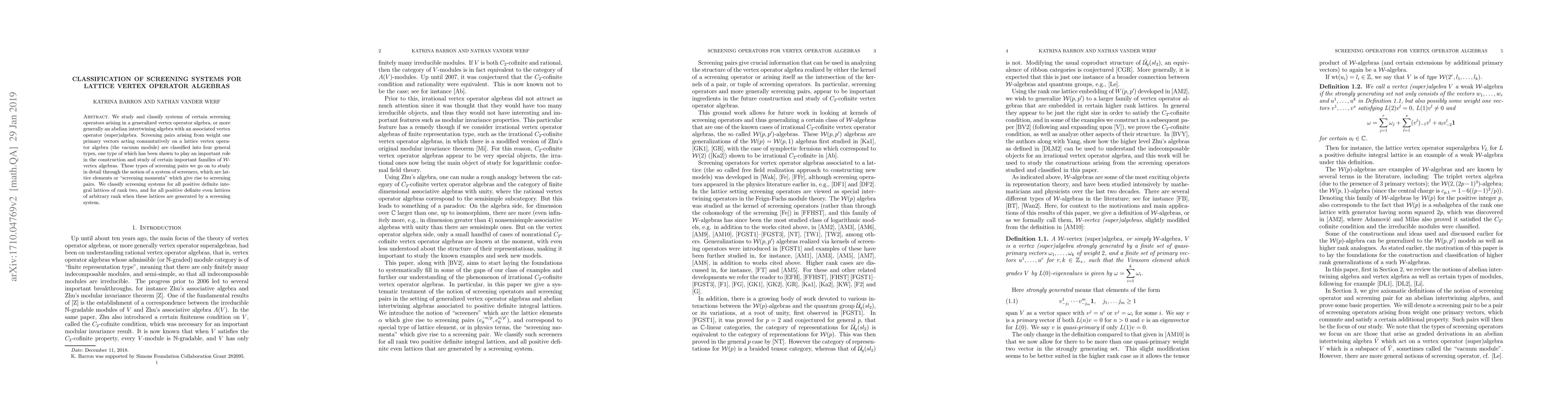 We study and classify systems of certain screening operators arising in a generalized vertex operator algebra, or more generally an abelian intertwining algebra with an associated vertex operator (super)algebra. Screening pairs arising from weight one primary vectors acting commutatively on a lattice vertex operator algebra (the vacuum module) are classified into four general types, one type of which has been shown to play an important role in the construction and study of certain important families of $\mathcal{W}$-vertex algebras. These types of screening pairs we go on to study in detail through the notion of a system of screeners, which are lattice elements or `screening momenta' which give rise to screening pairs. We classify screening systems for all positive definite integral lattices of rank two, and for all positive definite even lattices of arbitrary rank when these lattices are generated by a screening system.