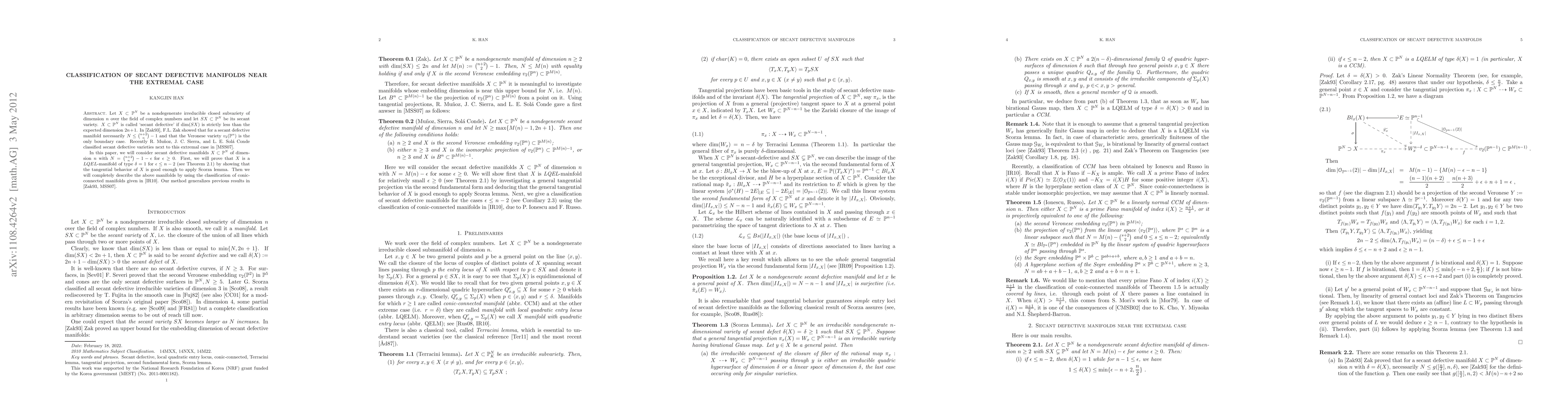 Let $X\subset \P^N$ be a nondegenerate irreducible closed subvariety of dimension $n$ over the field of complex numbers and let $SX\subset\P^N$ be its secant variety. $X\subset\P^N$ is called `secant defective' if $\dim(SX)$ is strictly less than the expected dimension $2n+1$. In \cite{Z1}, F.L. Zak showed that for a secant defective manifold necessarily $N\le{n+2 \choose n}-1$ and that the Veronese variety $v_2(\P^n)$ is the only boundary case. Recently R. Mu$\tilde{\textrm{n}}$oz, J. C. Sierra, and L. E. Sol\'a Conde classified secant defective varieties next to this extremal case in \cite{MSS}. In this paper, we will consider secant defective manifolds $X\subset\P^N$ of dimension $n$ with $N={n+2 \choose n}-1-\epsilon$ for $\epsilon\ge0$. First, we will prove that $X$ is a $LQEL$-manifold of type $\delta=1$ for $\epsilon\le n-2$ (see Theorem \ref{main_thm}) by showing that the tangential behavior of $X$ is good enough to apply Scorza lemma. Then we will completely describe the above manifolds by using the classification of conic-connected manifolds given in \cite{IR1}. Our method generalizes previous results in \cite{Z1,MSS}.