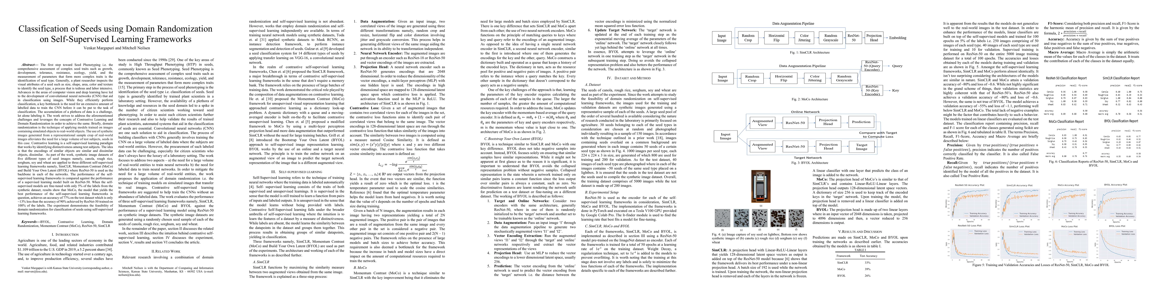 This research explores the use of self-supervised learning frameworks with domain randomization to classify seeds efficiently. The study employs synthetic image datasets to reduce the need for extensive labeled data, achieving competitive classification accuracy with only a small percentage of labeled samples. The best-performing model, Momentum Contrast (MoCo), demonstrates promising results, showing that it can achieve nearly 87% of the accuracy of a fully supervised model.