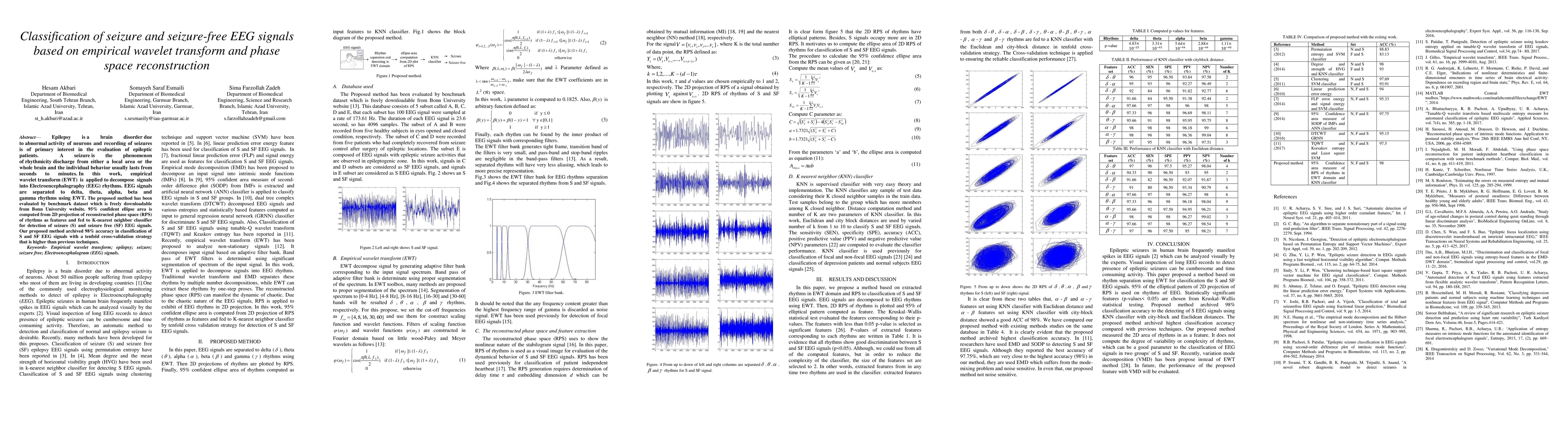 This paper proposes a method using empirical wavelet transform (EWT) to decompose EEG signals into rhythms for classifying seizure and seizure-free EEG signals. The method achieves 98% accuracy using reconstructed phase space features and a K-nearest neighbor classifier, outperforming previous techniques.