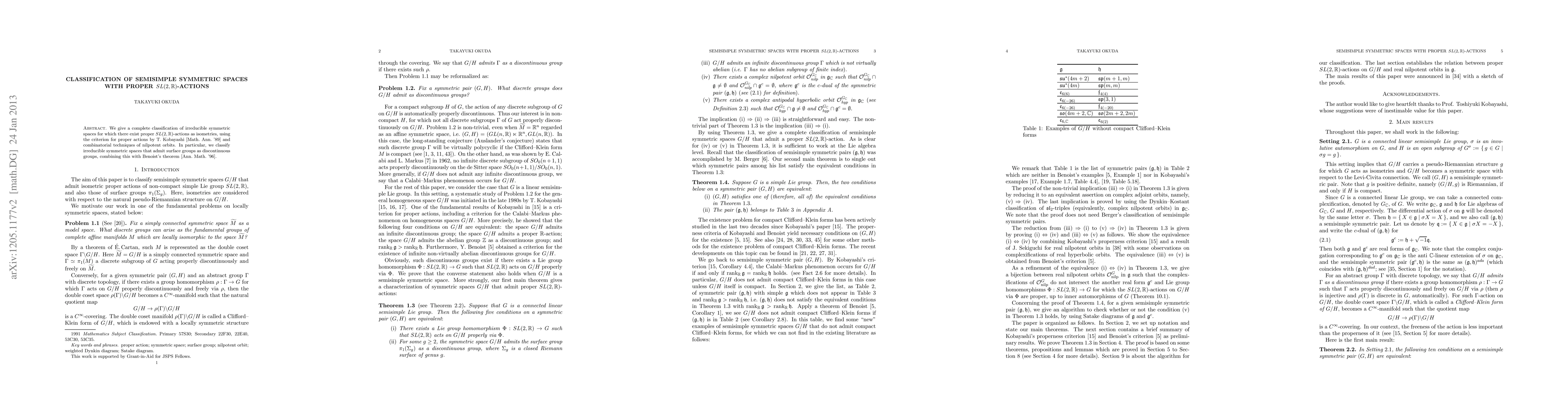 This paper provides a complete classification of irreducible symmetric spaces with proper SL(2,R)-actions using Kobayashi's criteria and nilpotent orbit techniques. It also identifies those spaces admitting surface groups as discontinuous groups, leveraging Benoist's theorem.