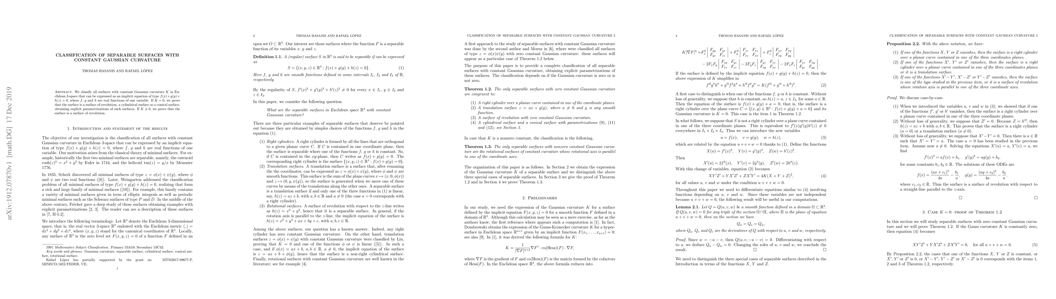 This paper classifies separable surfaces with constant Gaussian curvature in Euclidean 3-space, showing that for $K=0$, surfaces are either surfaces of revolution, cylindrical, or conical, while for $K\neq0$, they are surfaces of revolution. Explicit parametrizations are provided for each case.