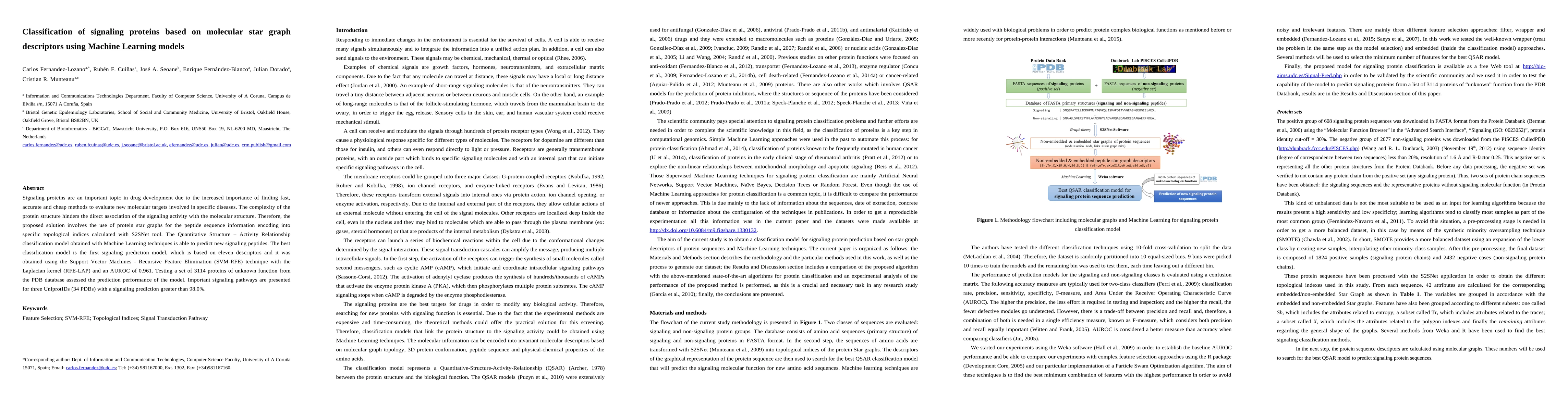 This paper proposes a machine learning model for classifying signaling proteins based on molecular star graph descriptors, using SVM-RFE with a Laplacian kernel to achieve an AUROC of 0.961. The model successfully predicts signaling peptides with high accuracy, tested on a set of 3,114 proteins from the PDB database.