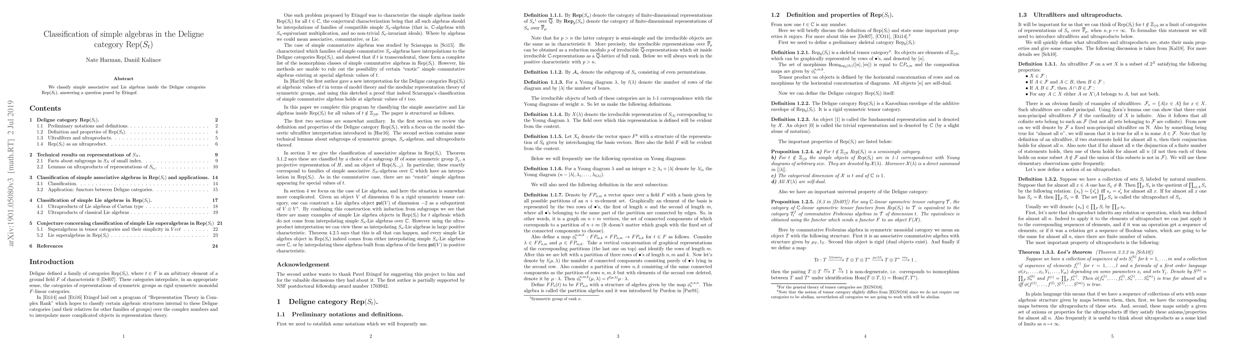 This research paper classifies simple associative and Lie algebras within Deligne categories $Rep(S_t)$, resolving a question posed by Etingof, and sheds light on the classification of algebras in these complex mathematical structures.