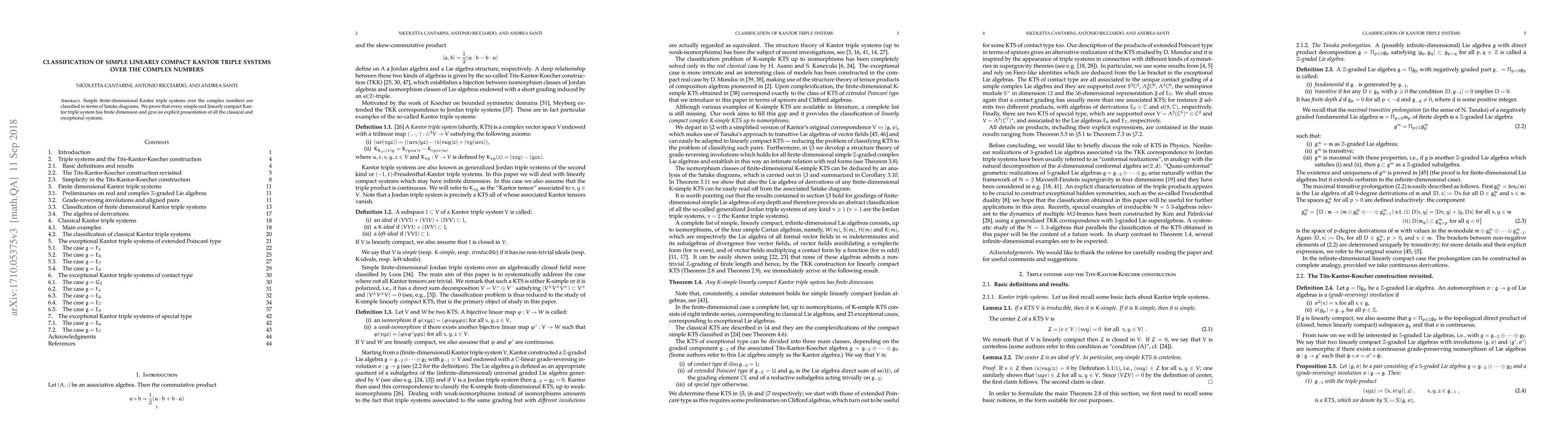 Simple finite dimensional Kantor triple systems over the complex numbers are classified in terms of Satake diagrams. We prove that every simple and linearly compact Kantor triple system has finite dimension and give an explicit presentation of all the classical and exceptional systems.