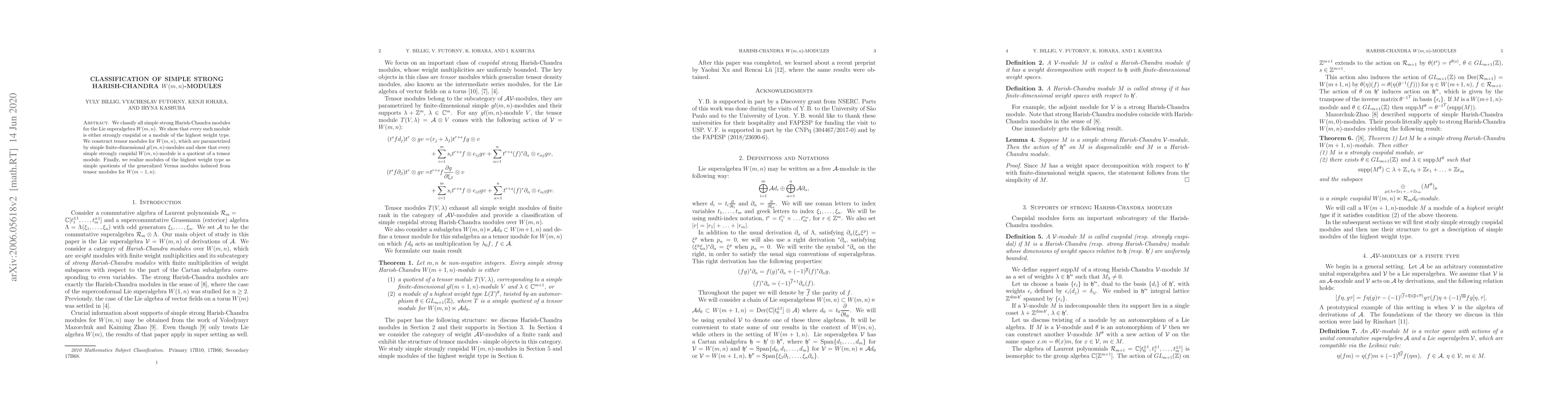 We classify all simple strong Harish-Chandra modules for the Lie superalgebra $W(m,n)$. We show that every such module is either strongly cuspidal or a module of the highest weight type. We construct tensor modules for $W(m,n)$, which are parametrized by simple finite-dimensional $gl(m,n)$-modules and show that every simple strongly cuspidal $W(m,n)$-module is a quotient of a tensor module. Finally, we realize modules of the highest weight type as simple quotients of the generalized Verma modules induced from tensor modules for $W(m-1,n)$.