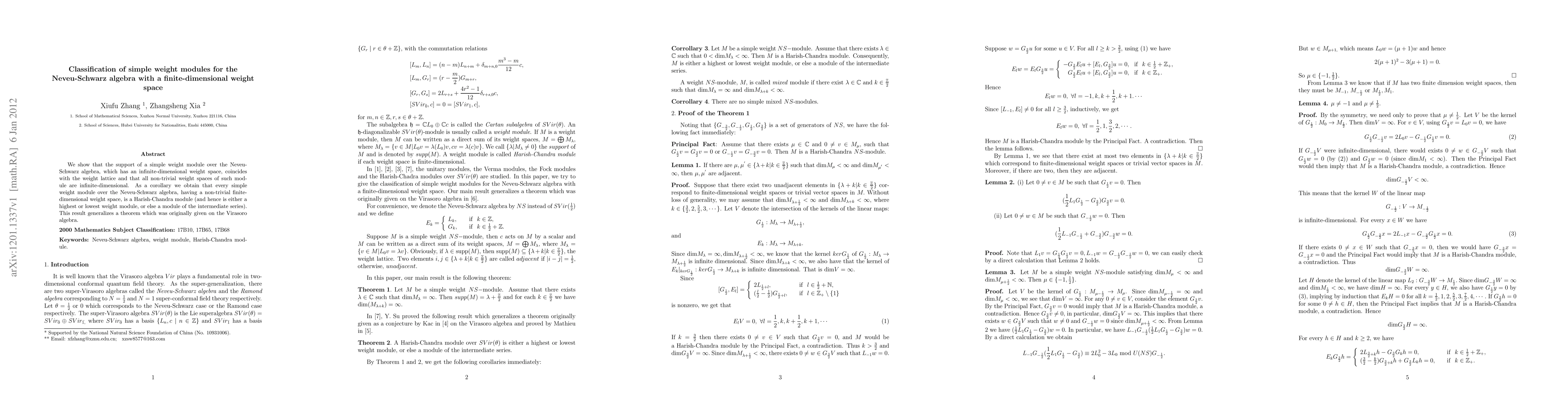 Summary: The paper classifies simple weight modules for the Neveu-Schwarz algebra with finite-dimensional weight spaces, proving they are Harish-Chandra modules, either highest, lowest, or intermediate series, and generalizes a similar theorem for the Virasoro algebra.