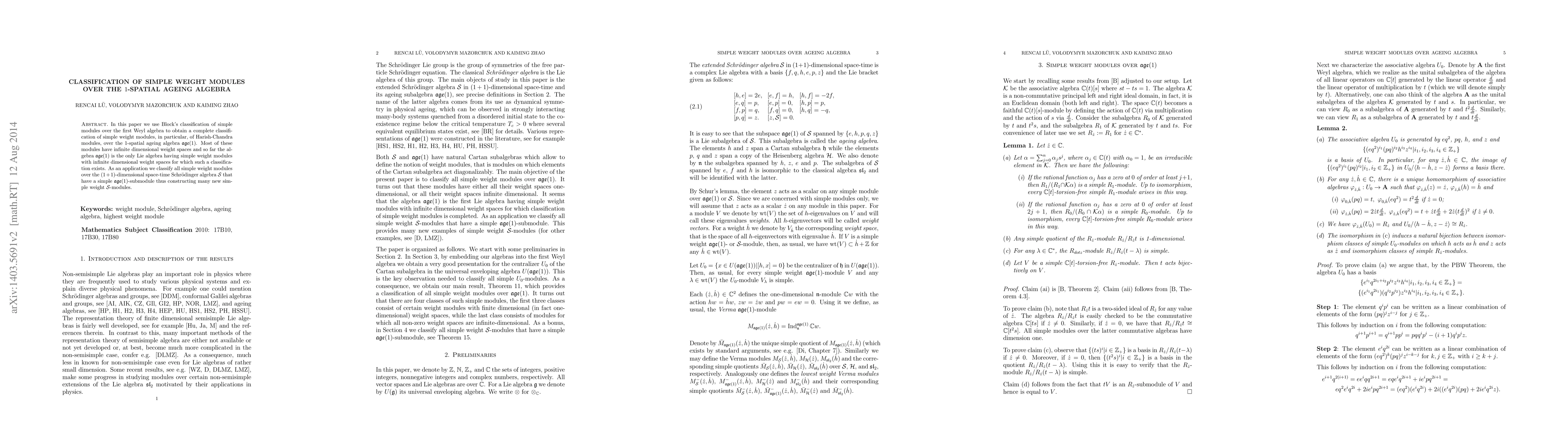 This paper classifies simple weight modules over the 1-spatial ageing algebra age(1), extending Block's classification of simple modules over the first Weyl algebra. It identifies Harish-Chandra modules with infinite-dimensional weight spaces, providing a unique classification for such modules.