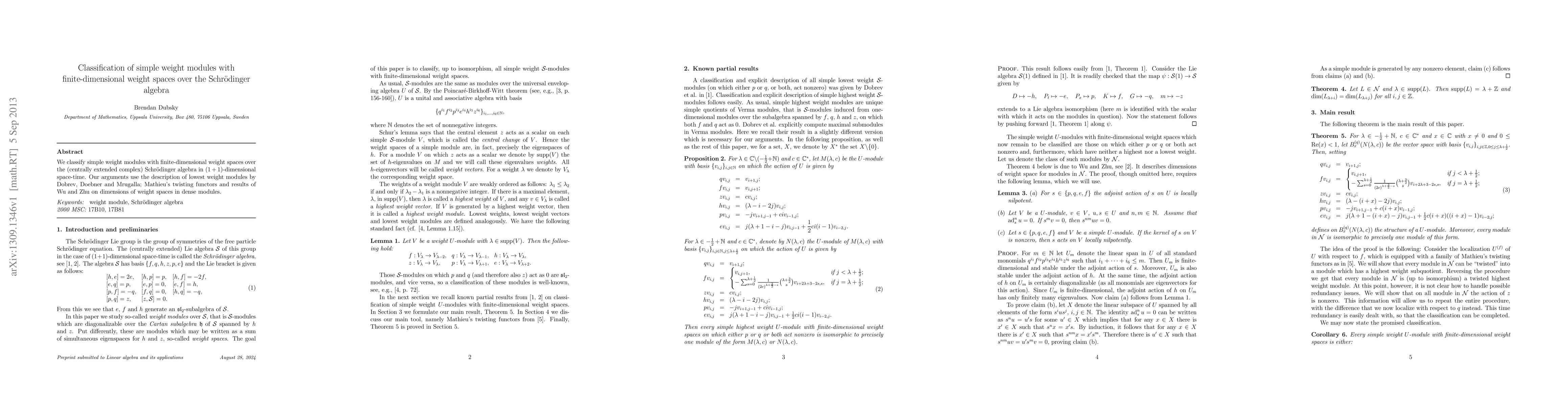 We classify simple weight modules with finite-dimensional weight spaces over the (centrally extended complex) Schr\"odinger algebra in (1+1)-dimensional space-time. Our arguments use the description of lowest weight modules by Dobrev, Doebner and Mrugalla; Mathieu's twisting functors and results of Wu and Zhu on dimensions of weight spaces in dense modules.