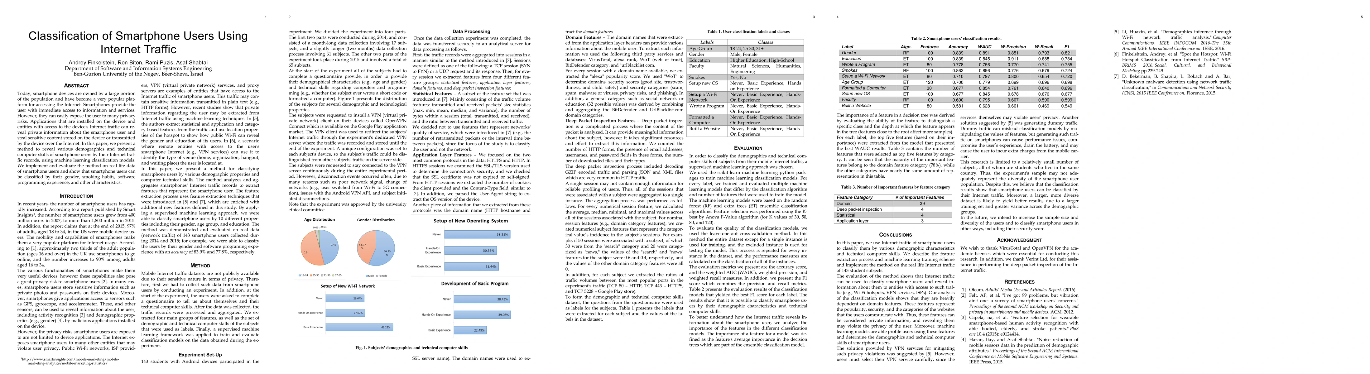This paper proposes a machine learning method to classify smartphone users based on their Internet traffic data, revealing demographics and technical skills like gender, smoking habits, and programming experience. The method is evaluated on real user data, demonstrating its effectiveness in identifying user characteristics.