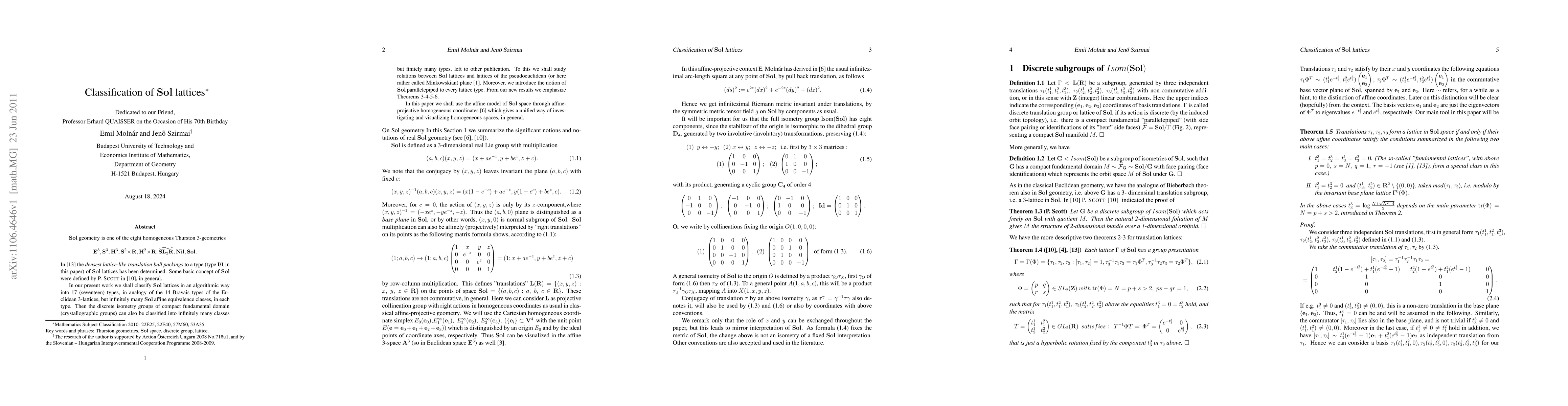 $\SOL$ geometry is one of the eight homogeneous Thurston 3-geomet-ri-es $$\EUC, \SPH, \HYP, \SXR, \HXR, \SLR, \NIL, \SOL.$$ In \cite{Sz10} the {\it densest lattice-like translation ball packings} to a type (type {\bf I/1} in this paper) of $\SOL$ lattices has been determined. Some basic concept of $\SOL$ were defined by {\sc{P. Scott}} in \cite{S}, in general. In our present work we shall classify $\SOL$ lattices in an algorithmic way into 17 (seventeen) types, in analogy of the 14 Bravais types of the Euclidean 3-lattices, but infinitely many $\SOL$ affine equivalence classes, in each type. Then the discrete isometry groups of compact fundamental domain (crystallographic groups) can also be classified into infinitely many classes but finitely many types, left to other publication. To this we shall study relations between $\SOL$ lattices and lattices of the pseudoeuclidean (or here rather called Minkowskian) plane \cite{AQ}. Moreover, we introduce the notion of $\SOL$ parallelepiped to every lattice type. From our new results we emphasize Theorems 3-4-5-6. In this paper we shall use the affine model of $\SOL$ space through affine-projective homogeneous coordinates \cite{M97} which gives a unified way of investigating and visualizing homogeneous spaces, in general.