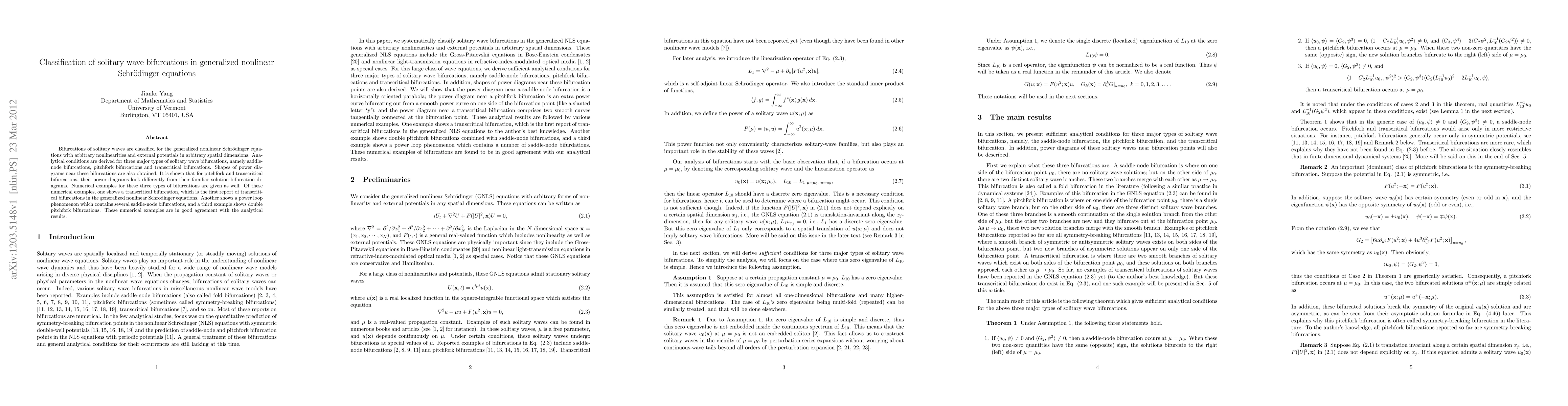 This paper classifies solitary wave bifurcations in generalized nonlinear Schrödinger equations, deriving analytical conditions for saddle-node, pitchfork, and transcritical bifurcations. It reveals distinct power diagram shapes near these bifurcations and provides numerical examples validating the analytical findings, including the first report of transcritical bifurcations in these equations.