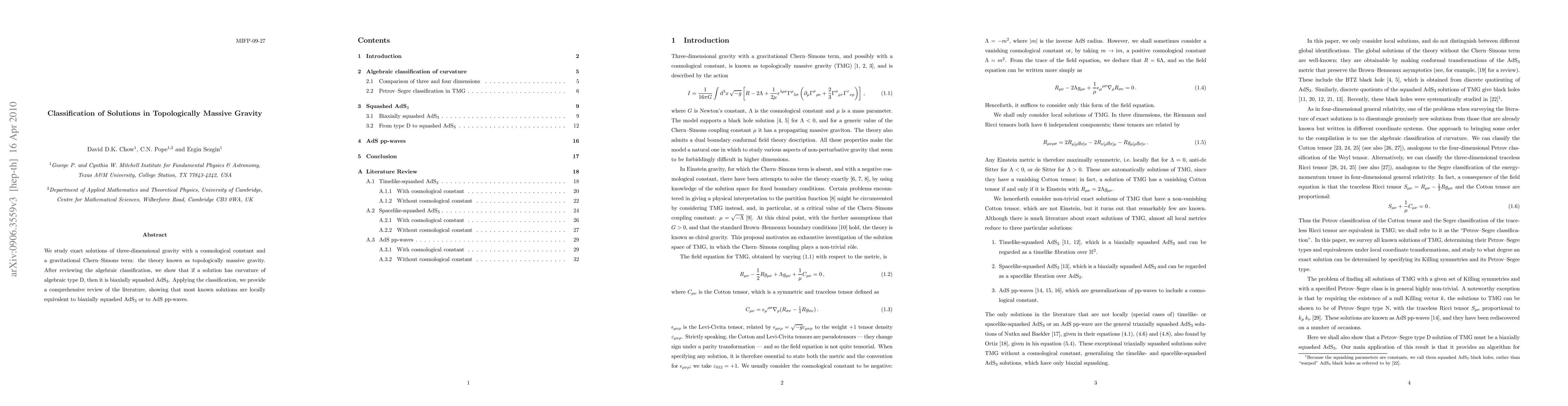 We study exact solutions of three-dimensional gravity with a cosmological constant and a gravitational Chern-Simons term: the theory known as topologically massive gravity. After reviewing the algebraic classification, we show that if a solution has curvature of algebraic type D, then it is biaxially squashed AdS_3. Applying the classification, we provide a comprehensive review of the literature, showing that most known solutions are locally equivalent to biaxially squashed AdS_3 or to AdS pp-waves.