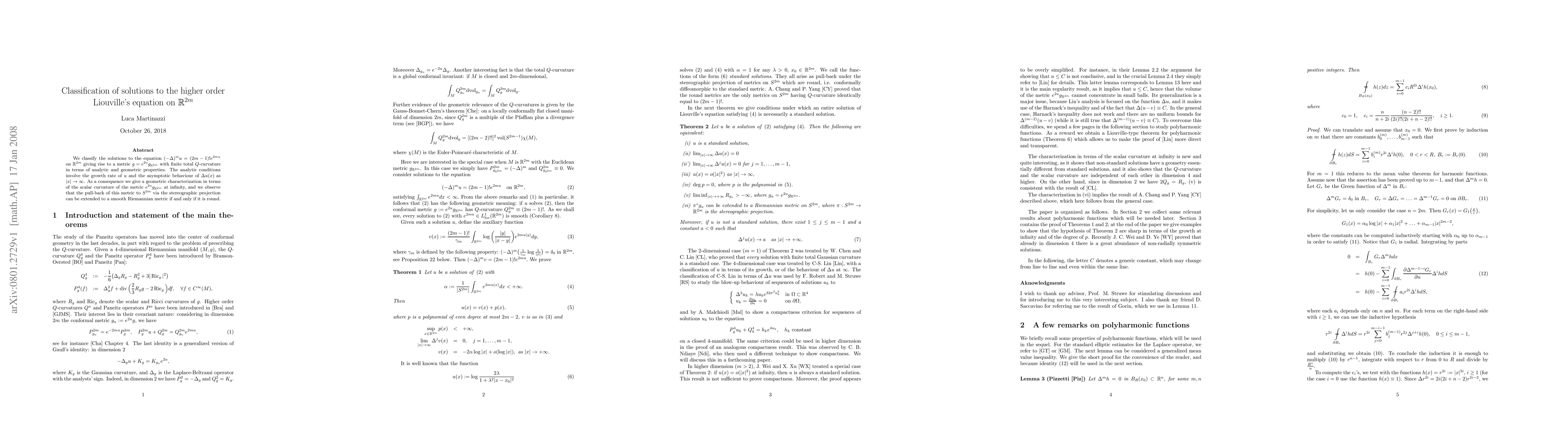 We classify the solutions to the equation (- \Delta)^m u=(2m-1)!e^{2mu} on R^{2m} giving rise to a metric g=e^{2u}g_{R^{2m}} with finite total $Q$-curvature in terms of analytic and geometric properties. The analytic conditions involve the growth rate of u and the asymptotic behaviour of \Delta u(x) as |x|\to \infty. As a consequence we give a geometric characterization in terms of the scalar curvature of the metric e^{2u}g_{R^{2m}} at infinity, and we observe that the pull-back of this metric to $S^{2m}$ via the stereographic projection can be extended to a smooth Riemannian metric if and only if it is round.