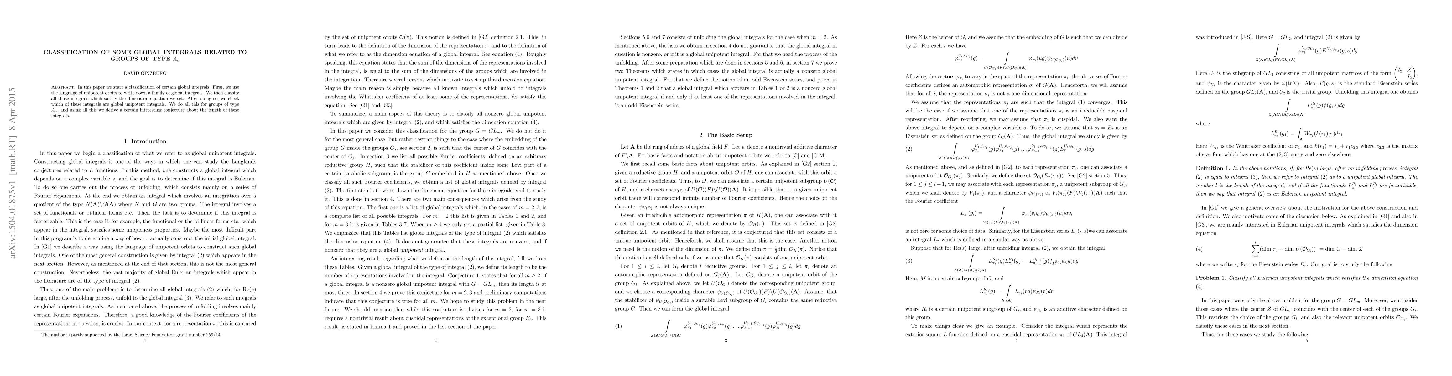 In this paper we start a classification of certain global integrals. First, we use the language of unipotent orbits to write down a family of global integrals. We then classify all those integrals which satisfy the dimension equation we set. After doing so, we check which of these integrals are global unipotent integrals. We do all this for groups of type $A_n$, and using all this we derive a certain interesting conjecture about the length of these integrals.